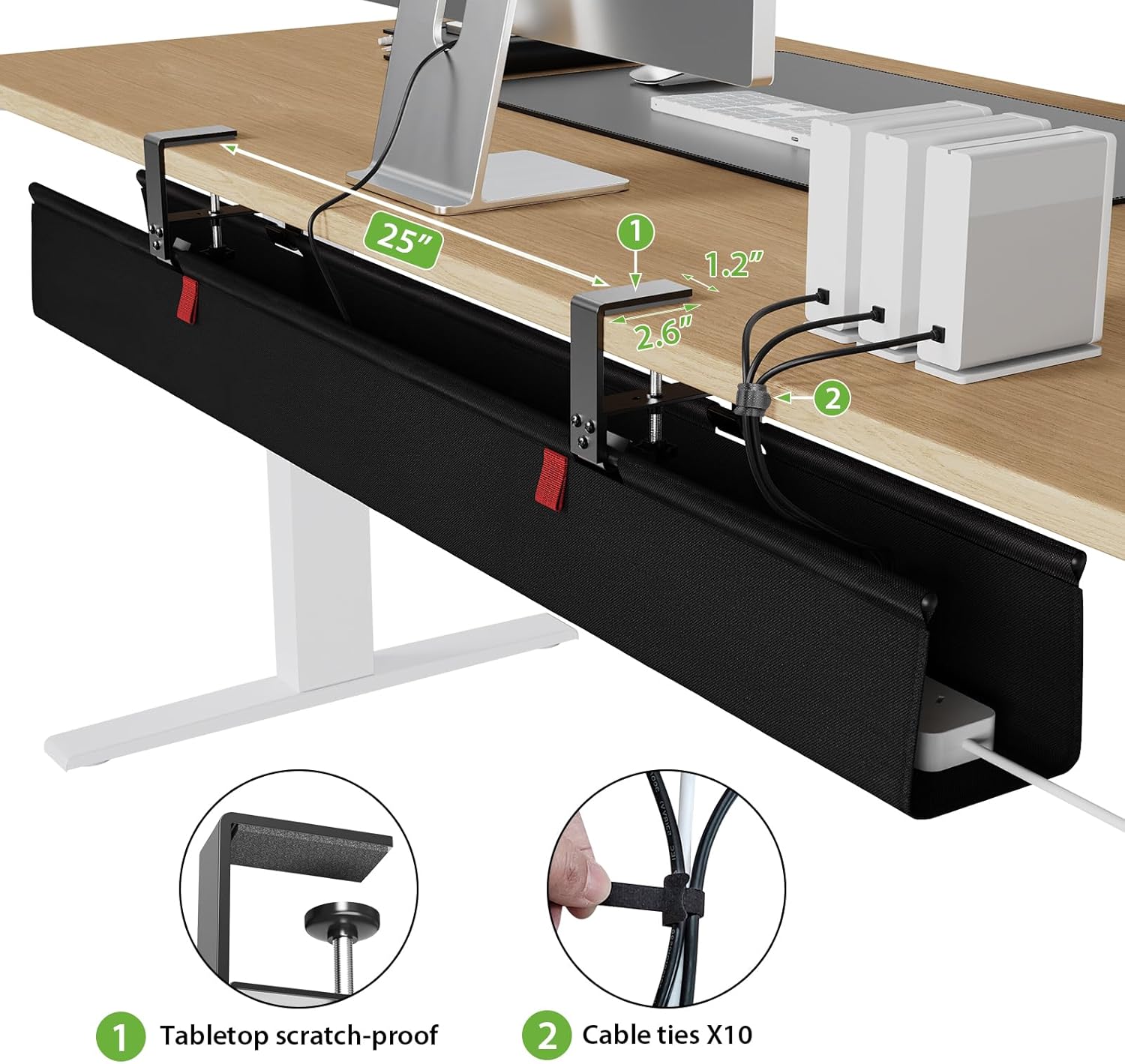 - [Large Capacity] - With the KEEGH no drill cable management under desk, featuring an 28-inch size to accommodate all your power extensions, adapters, extra wires, power strips, power banks, chargers and more. Keep your workspace tidy and organized. Say goodbye to visible cords with the revolutionary fabric material that completely hides all wires for a clutter-free look!