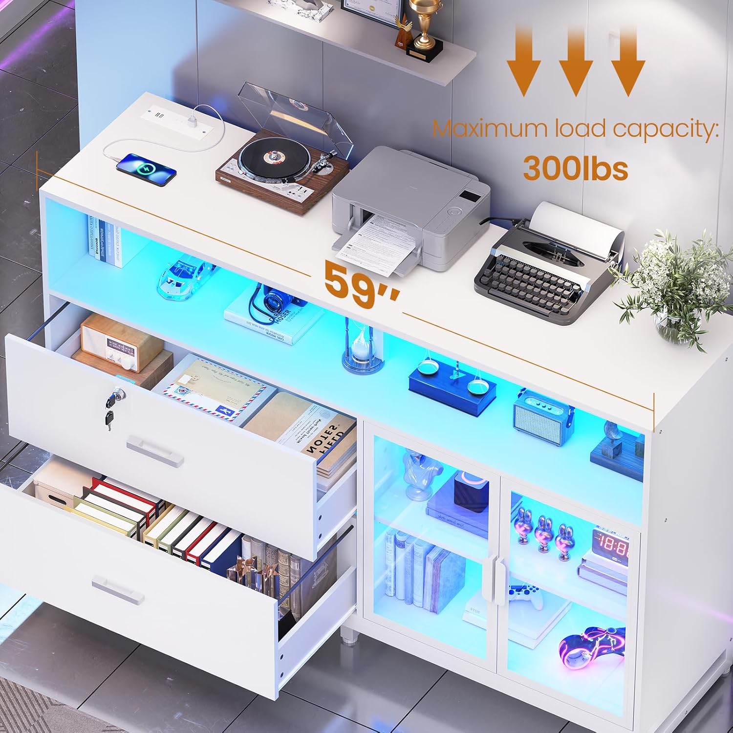 SEDETA 59" File Cabinet, 2 Drawers Filing Cabinets for Home Office fit Legal/Letter/A4 File, File Cabinet with Lock & Power Outlets, Printer Stand with Storage & LED Lights, White