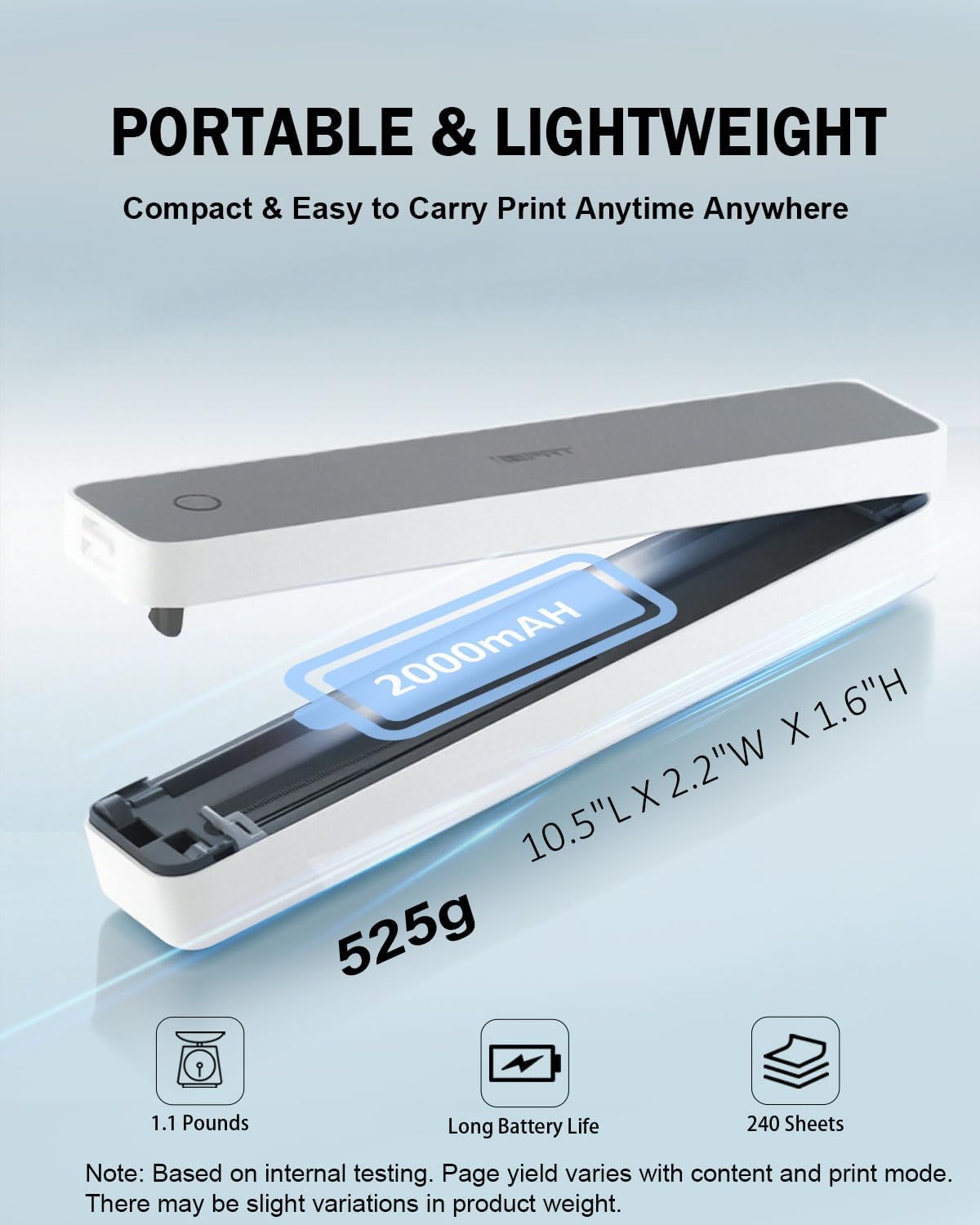 - Ultra Light Travel Printer: At just 1.1lb (526g) and 1.6 inches thick, this portable thermal printer fits easily into your backpack or work bag. Whether you're on a business trip, campus, café, or coworking space, print contracts, lecture notes, or documents on the go—no desk needed!