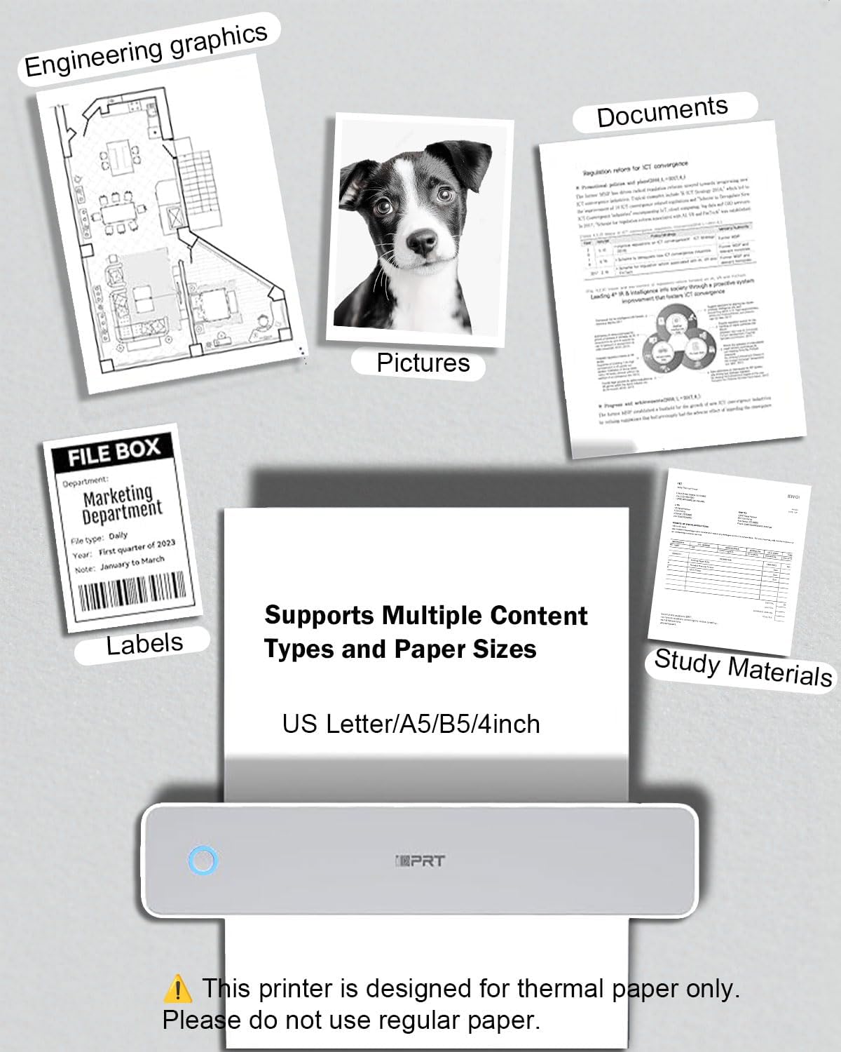 - Gift Worthy Printer for Work or Study:This compact thermal printer supports US Letter/ A4/ A5/ B5 / 4-inch paper sizes. Print PDFs, notes, receipts, and reports on demand. Ideal for students, digital nomads, field professionals, or anyone needing portable printing—makes a practical and thoughtful gift too.