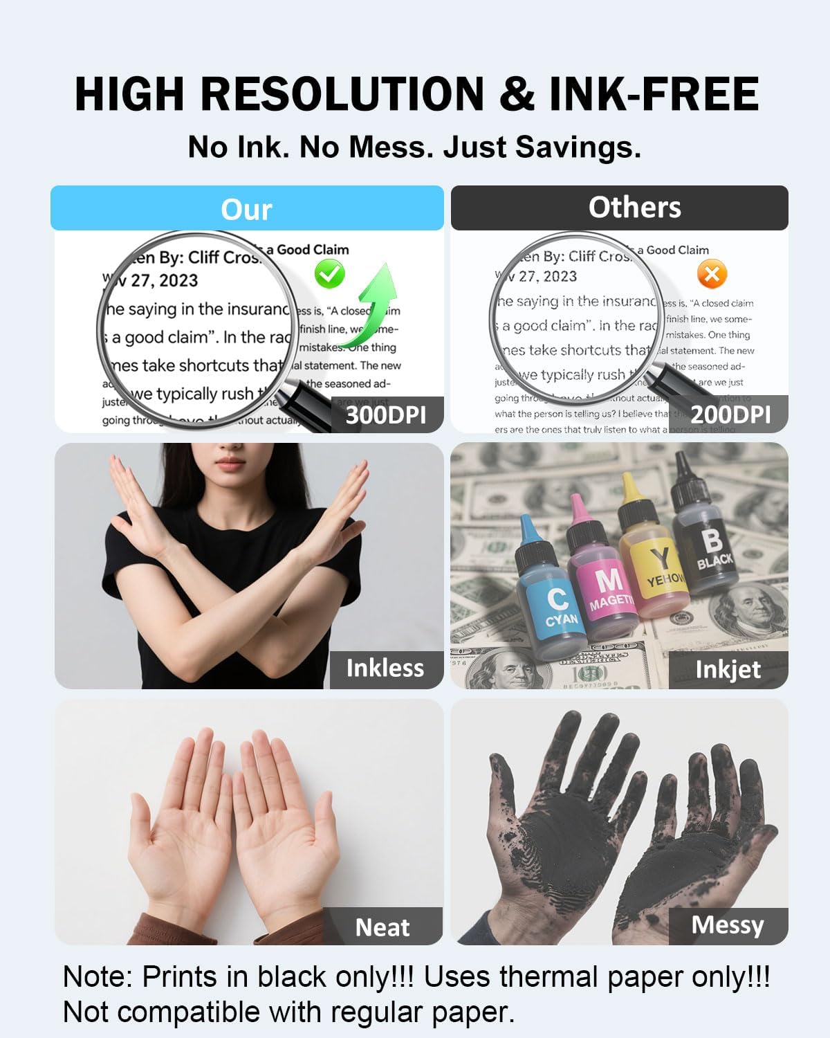 - Inkless Thermal Printer – No Ink, No Mess! Say goodbye to cartridges and toner! The iDPRT 610Pro portable printer uses advanced thermal technology for clean, cost-effective, 300DPI printing—anytime, anywhere. Includes: printer, 10 sheets thermal paper, USB-C cable & free app.(⚠️ Only compatible with black & white thermal paper. Not for inkjet/laser paper).