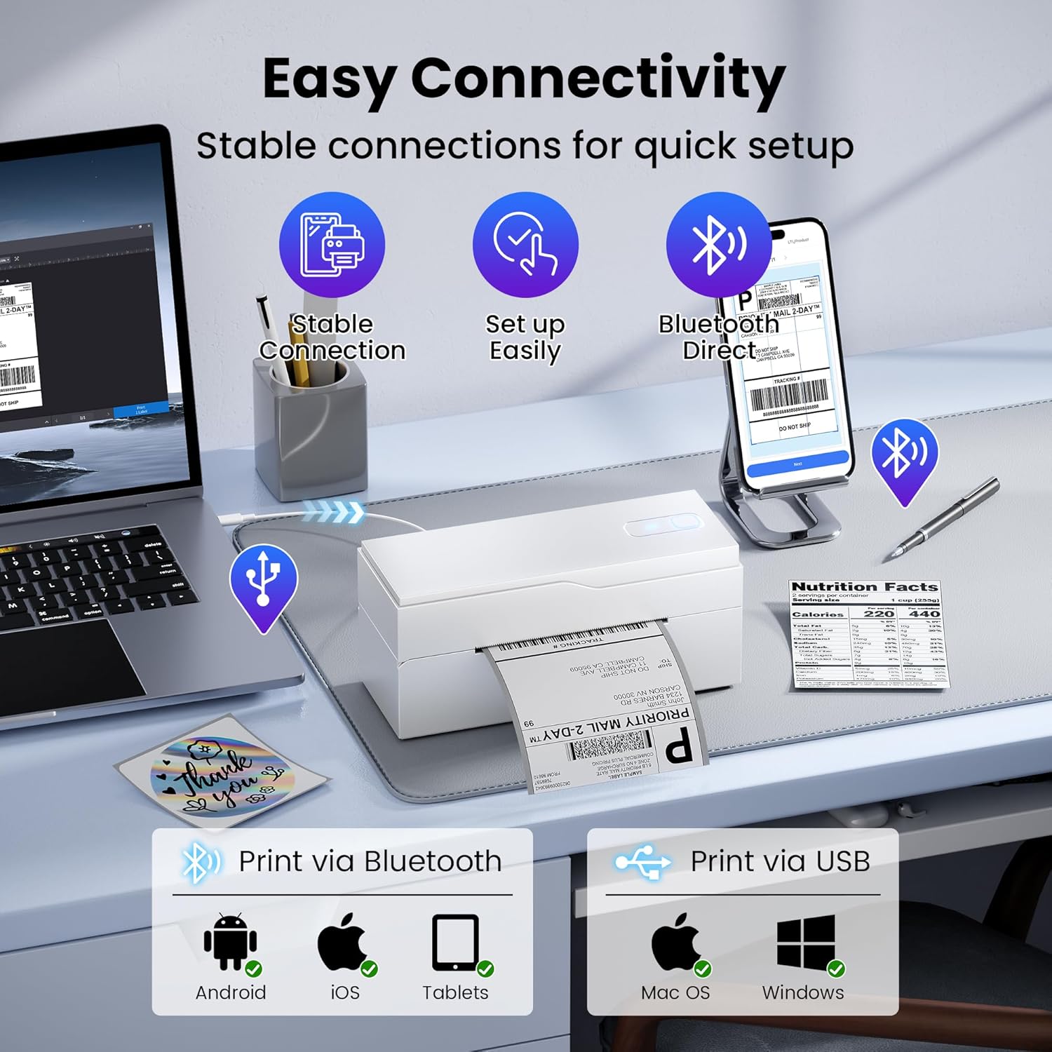 - Versatile Label Compatibility: This thermal printer supports a range of label sizes from 1" to 4.7" (25.4mm to 120mm), including shipping labels, mailing labels, price tags, barcode labels, name tags, and more, meeting all your shipping needs