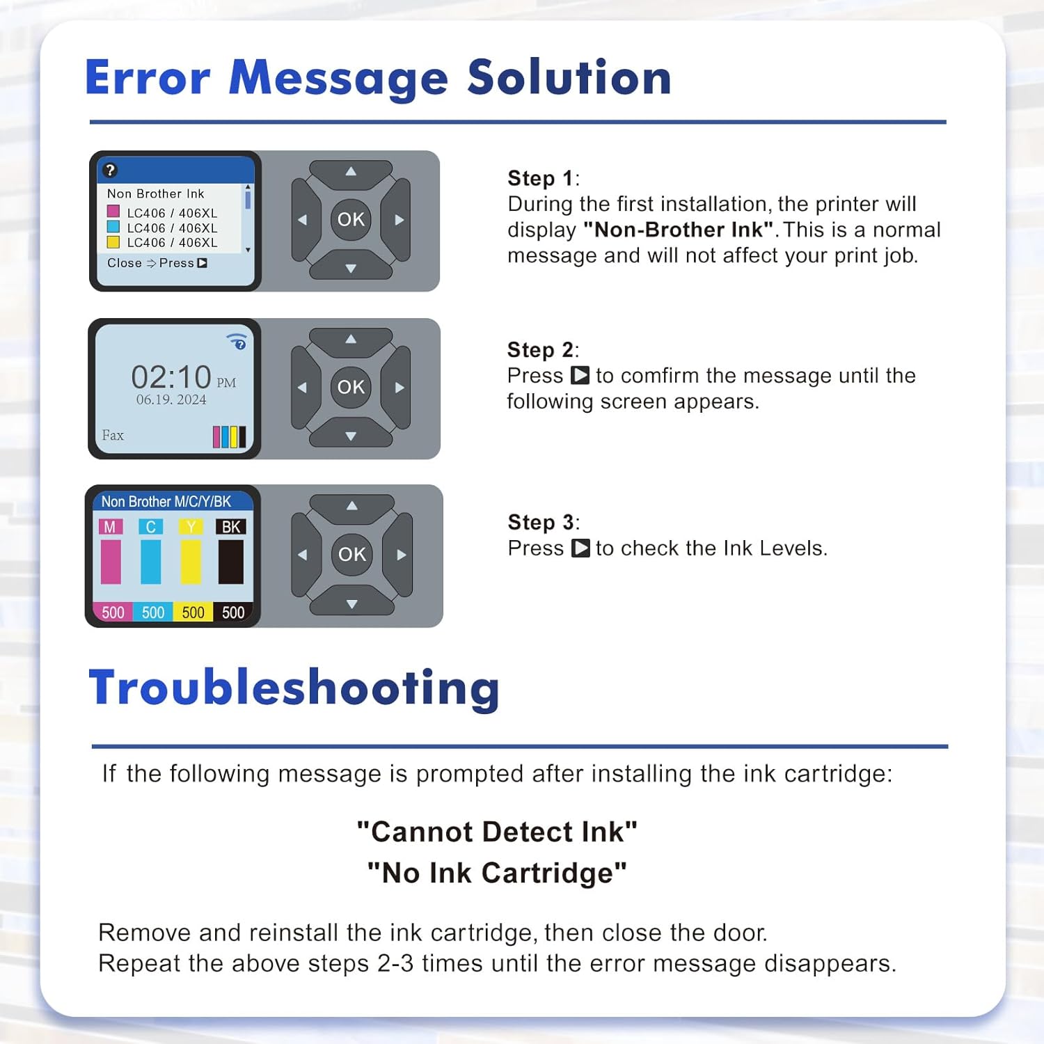 - Installation Tips: [1].Don't remove or touch the CHIP.[2]. When the printer prompts "non-original", please click OK or Next to continue. [3].When the printer appears "low ink", "empty", "replace ink cartridge" and other prompts, please remove the ink cartridge and reinstall it several times