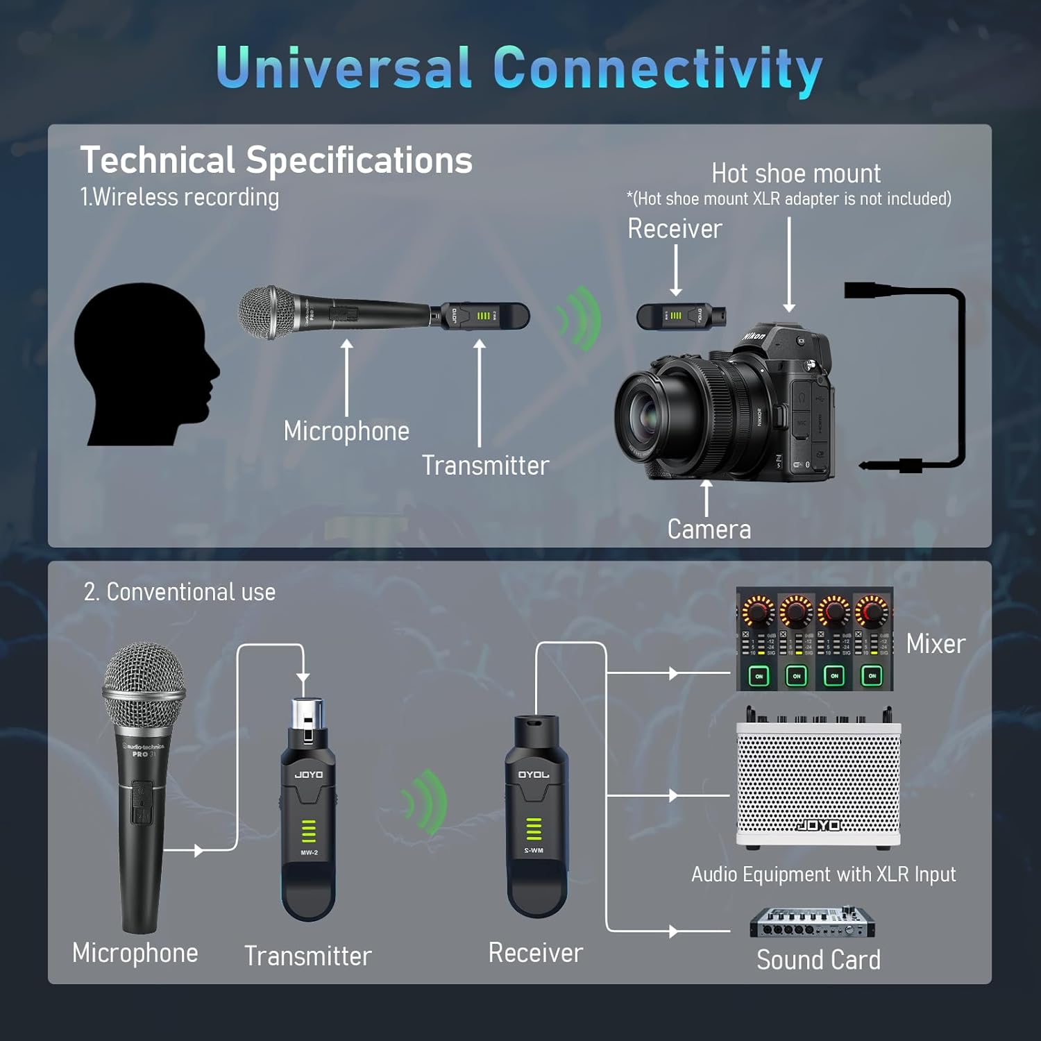 - 2.4GHz Wireless Microphone Auto-Pairing System: Instantly convert wired micrs to a pro wireless setup via plug-and-play. Optimized for dynamic microphones. Compatible with condenser microphones requiring 24V or lower phantom power only. Electromagnetic interference and microphone shielding variations may cause noise with some condenser models. For best results, we recommend using dynamic microphones or testing other alternative microphones.