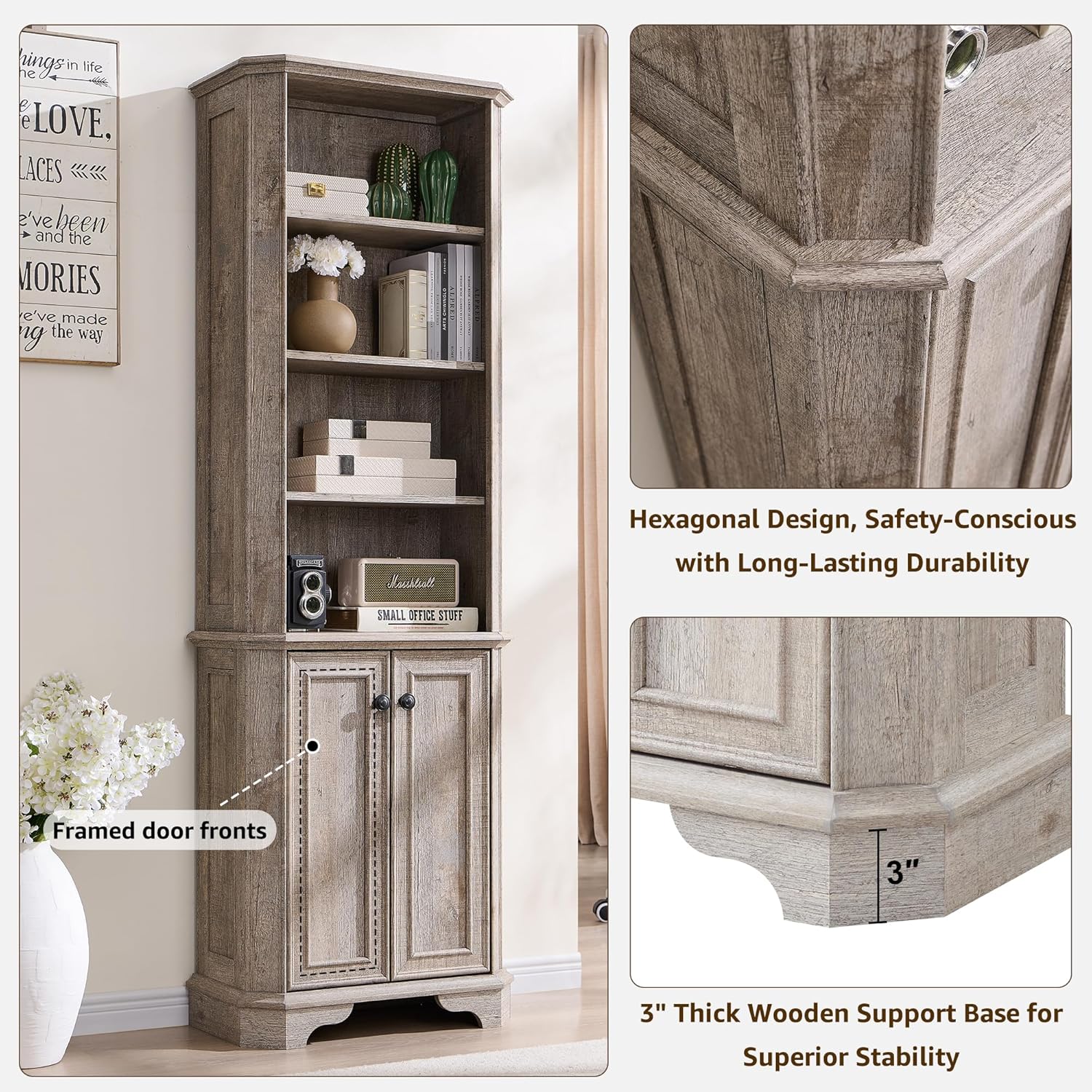 - Elegant & Sturdy 6-Tier Farmhouse Bookshelf with Farmhouse Charm: Upgrade your home office or living space with this 6-tier wood bookshelf, measuring 23.5”W x 11.7”D x 72”H. Designed to double as both a bookcase and a storage cabinet, it blends Victorian-style elegance with modern durability. The framed door fronts, hand-polished vintage mushroom knob, and a natural wood grain finish create a refined yet rustic aesthetic, enhancing any office or home décor