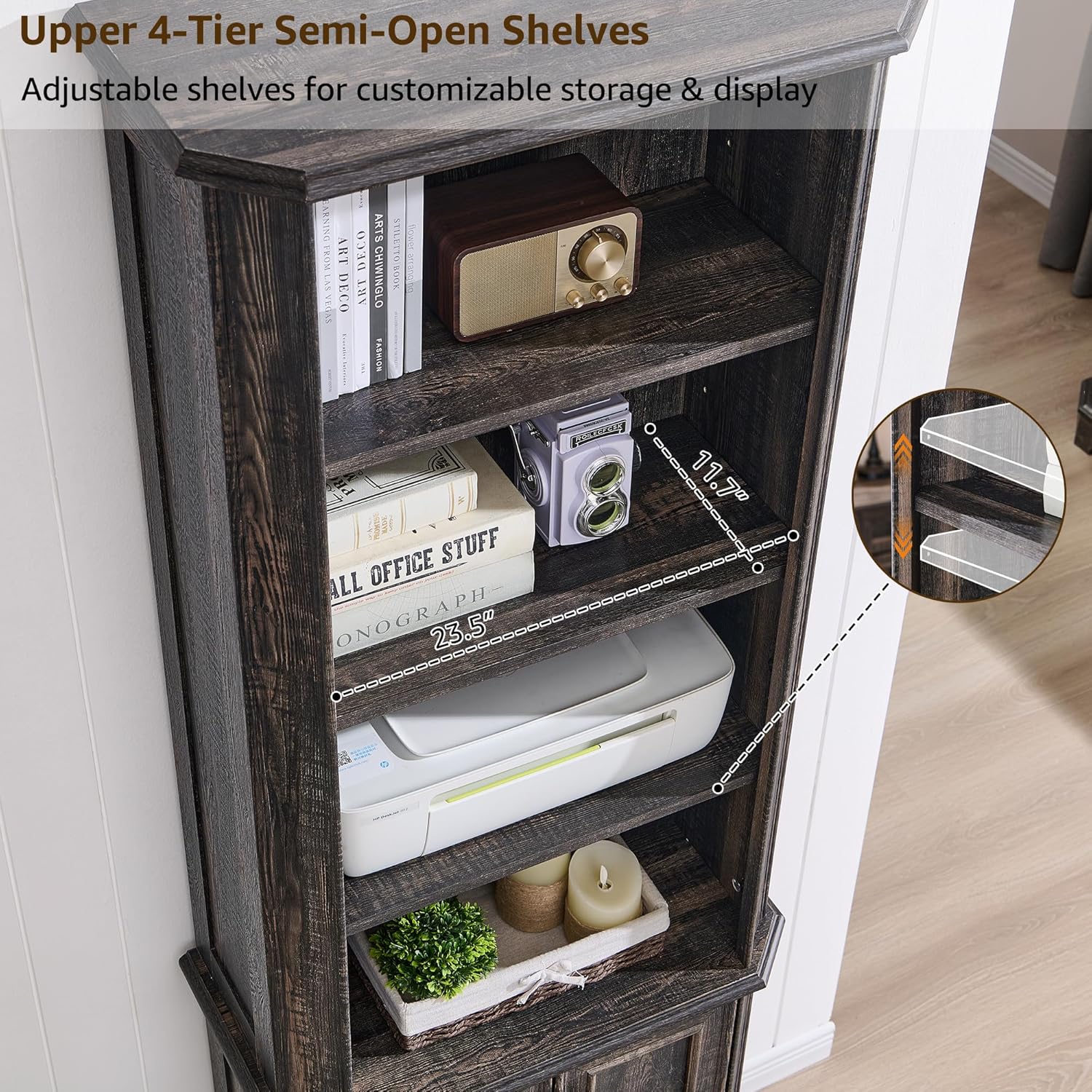 - 4 Adjustable Open Shelves:This wooden book shelf with door features four adjustable semi-open shelves, each with three height settings (up or down 2.5”), allowing you to customize shelf spacing between 7.2”-14.7” to fit books, trophies, decorative items, and frequently accessed items. bringing a touch of warmth and farmhouse style to your space
