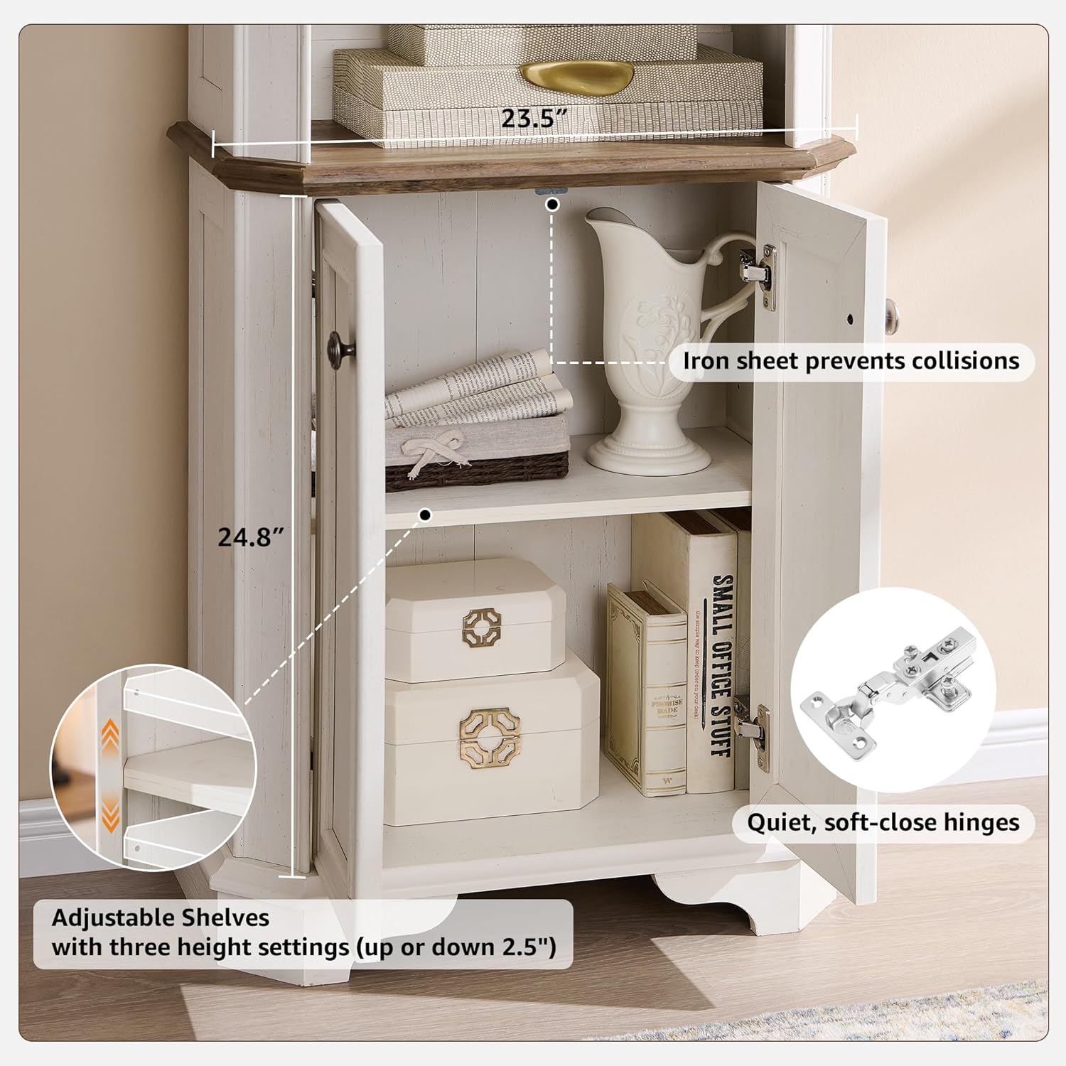 - Hidden Dual-Level Cabinets for Maximum Storage & Privacy: Discover a smart storage solution tucked behind elegant framed doors fronts. Two spacious tiers (23.5" W x 24.5" H) with three adjustable shelf settings let you tailor the space for your essentials. Enjoy whisper‑quiet soft‑close hinges that provide a serene, library‑like experience—keeping your items secure and your space clutter‑free