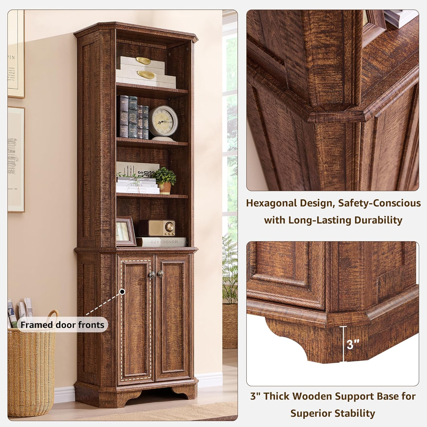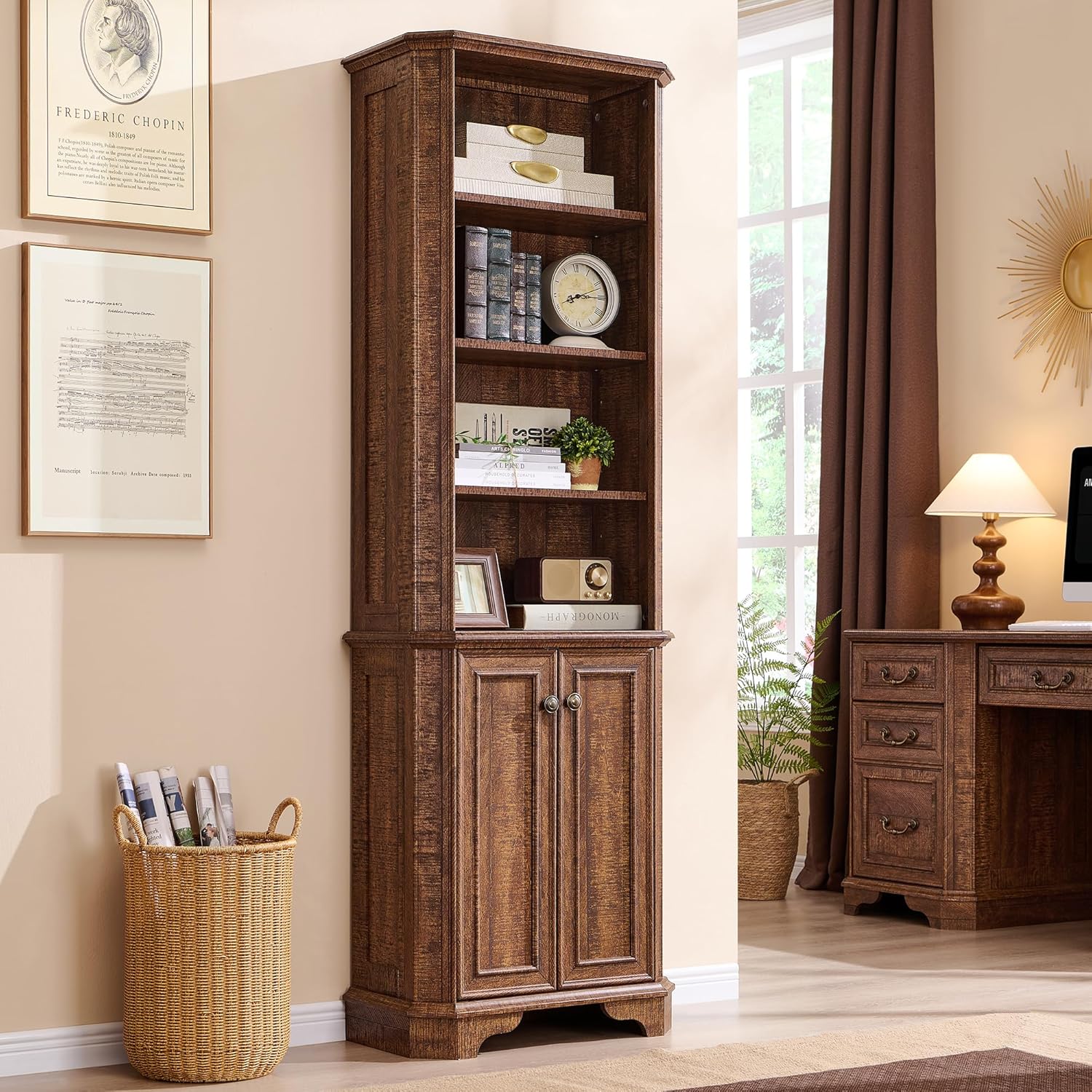 - Elegant & Sturdy 6-Tier Farmhouse Bookshelf with Farmhouse Charm: Upgrade your home office or living space with this 6-tier wood bookshelf, measuring 23.5”W x 11.7”D x 72”H. Designed to double as both a bookcase and a storage cabinet, it blends Victorian-style elegance with modern durability. The framed door fronts, hand-polished vintage mushroom knob, and a natural wood grain finish create a refined yet rustic aesthetic, enhancing any office or home décor