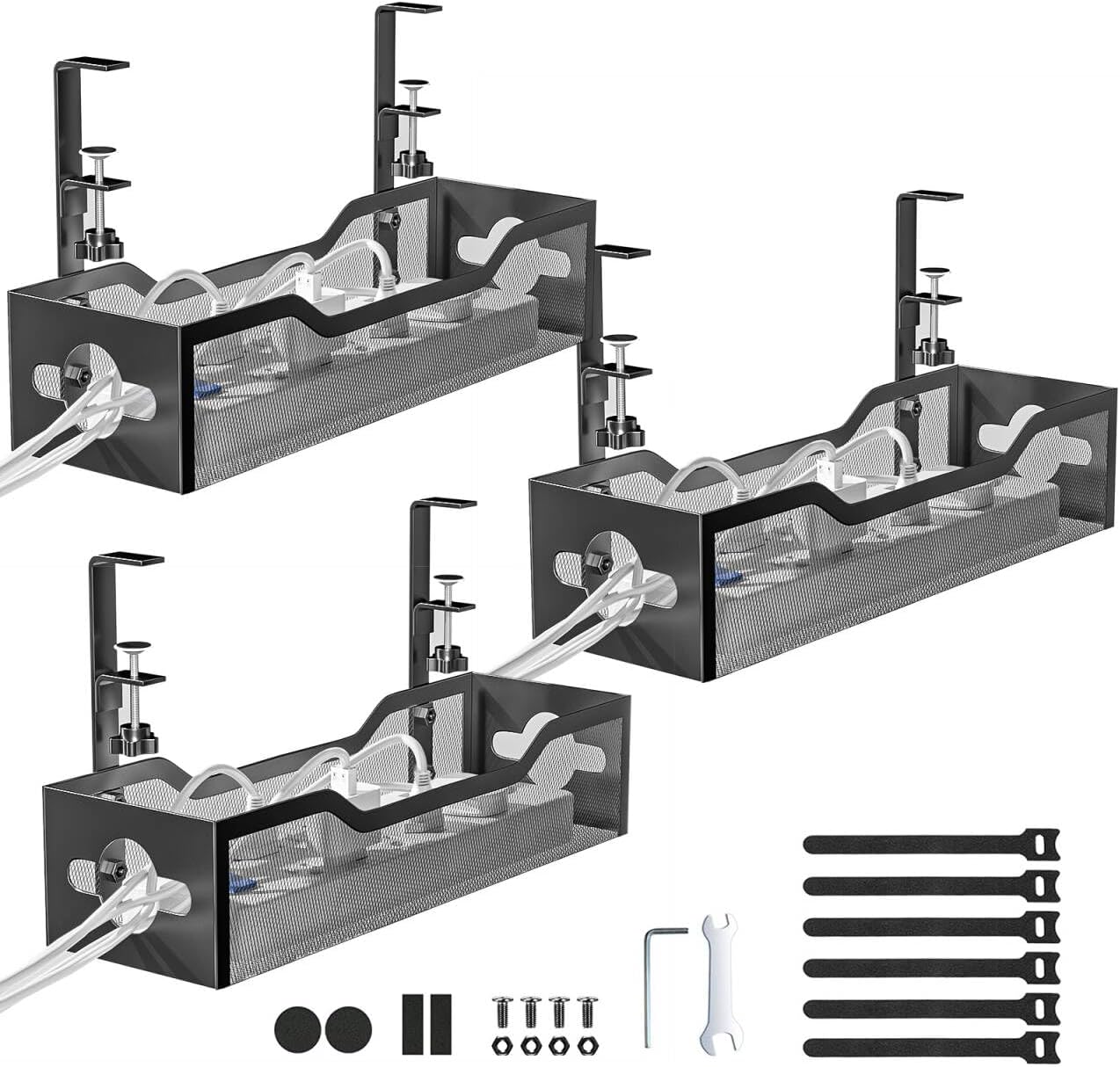 Under Desk Cable Management Tray 3 Pack, Cable Management Under Desk No Drill, Cable Organizer with Clamp for Wire Management, Cord Organizer for Office, Home - No Damage to Table (Black)