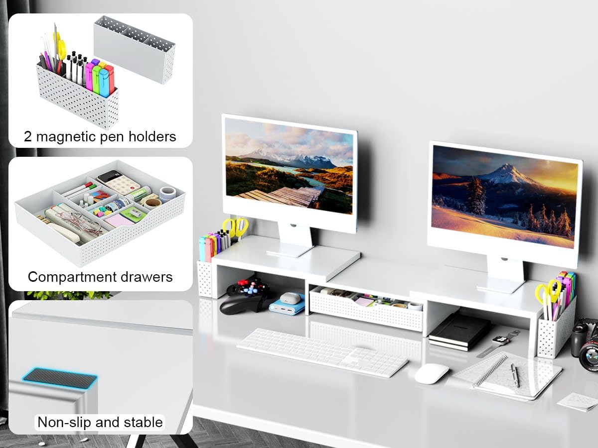 Spacrea Metal Desk Organizers and Accessories, Dual Monitor Stand Riser with Drawer and 2 Pen Holders, Desk Accessories & Workspace Desktop Organizers for Office Supplies (White)
