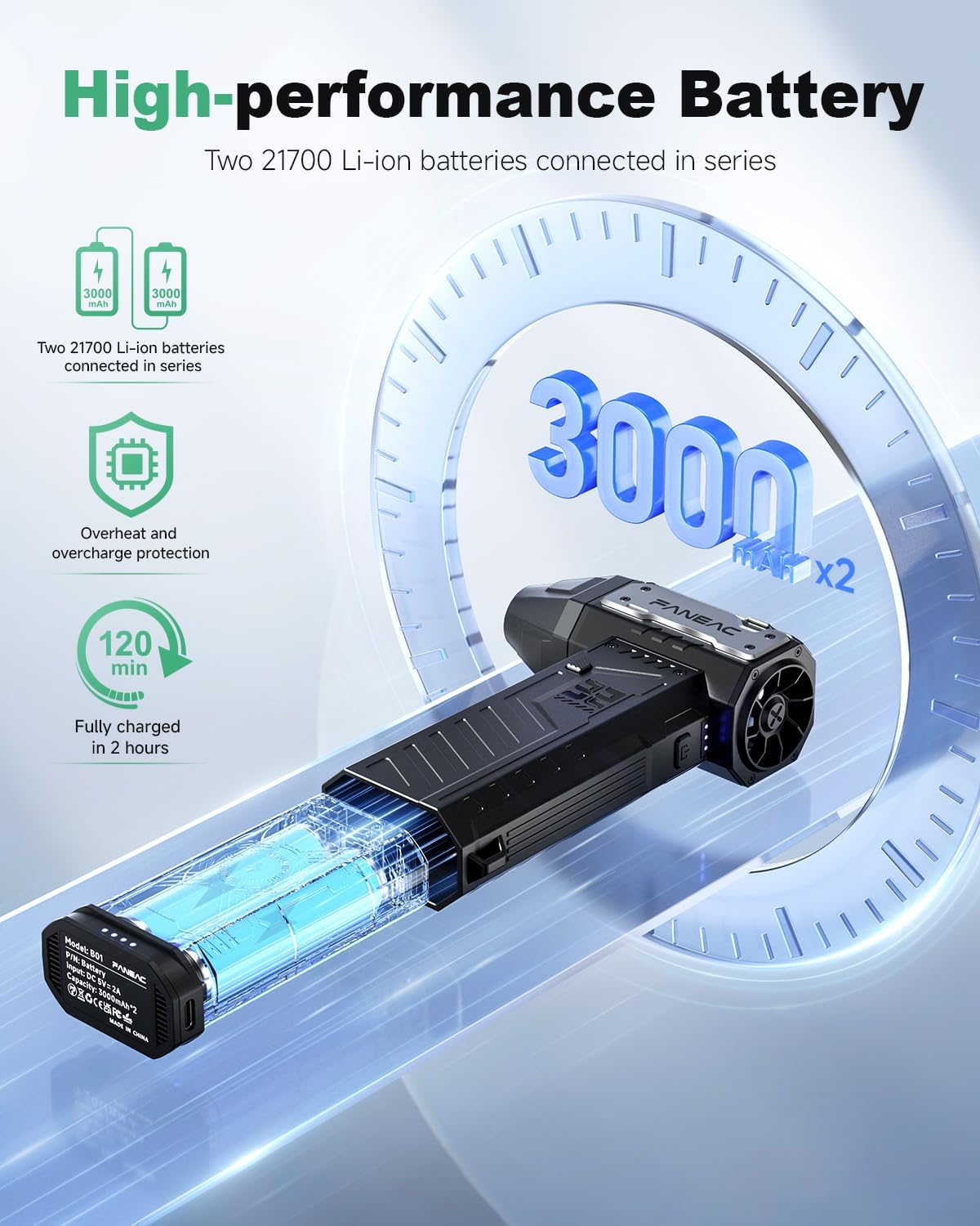- ULTRA-HIGH-SPEED BRUSHLESS MOTOR - This electric air duster features a powerful brushless motor, delivering strong airflow to blast away dust from keyboards, PCs, laptops, cameras, and other electronic devices.
