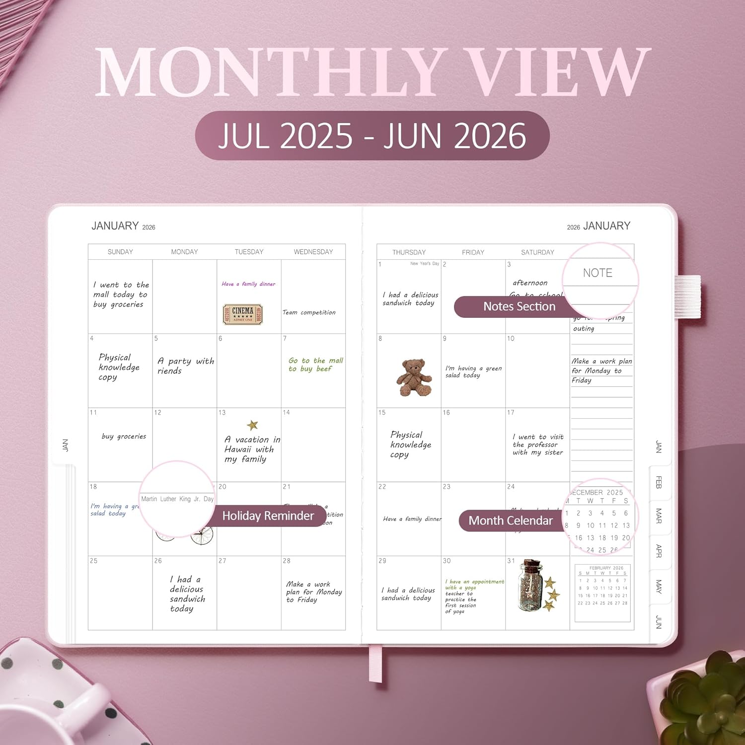 - Monthly View: Academic planner stay perfectly organized with our intuitive monthly calendar layout. Each date box offers ample writing room for all your appointments, meetings, and reminders. The smart design includes visual references to surrounding months and highlights official holidays, making it simple to plan ahead. Whether scheduling work projects or personal commitments, you'll love how easy it is to maintain your monthly overview.