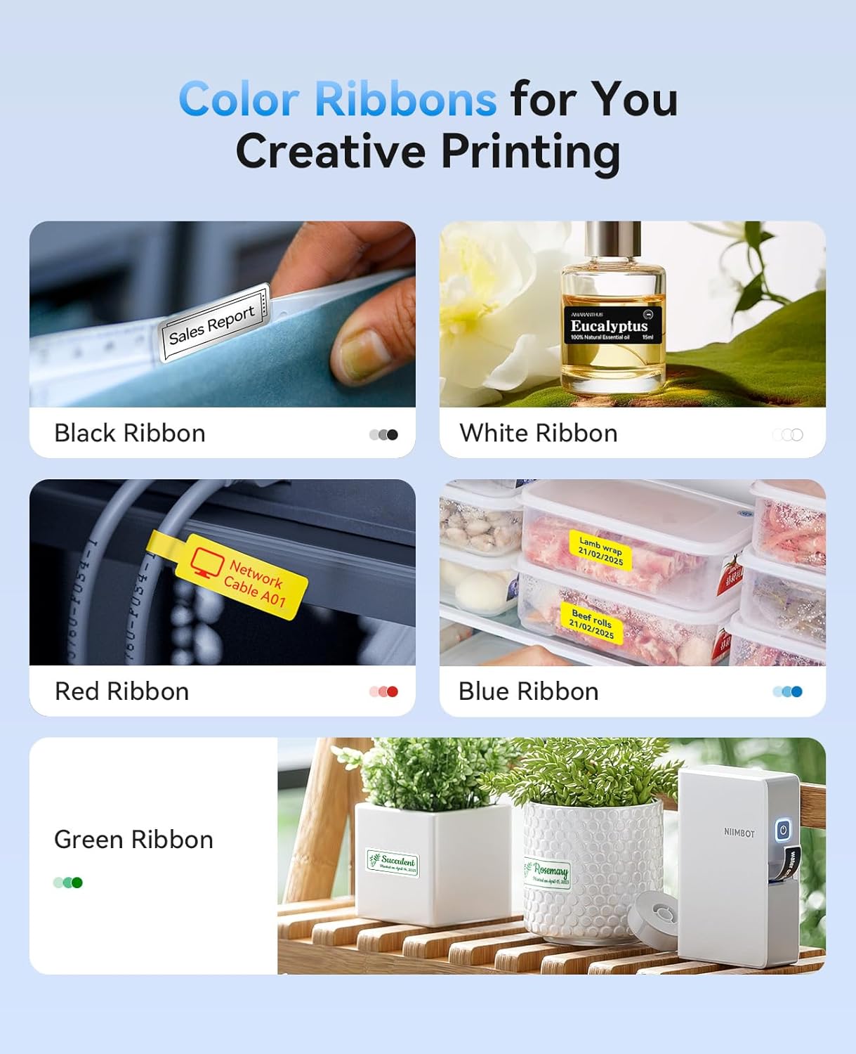 - Support Printing with Color Ribbon: 5 colors of ribbon and more than 20 types of label paper you can choose, can be matched with the best printing results as you wish. It is great for price tags, personal item identification, food date marking, cable identification, and more. Make your home office more eye-catching and organized