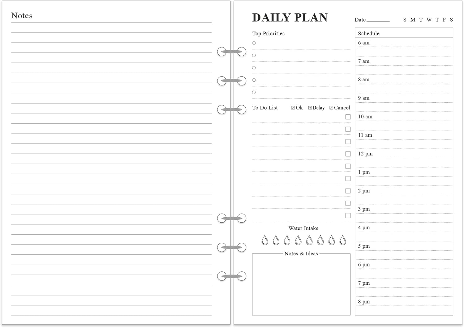 - MAKES YOUR LIFE PRODUCTIVE - This day planner refill page includes space for 5 top priorities, 9 to do list, daily schedule from 6am-8pm, notes&ideas and water intake. This to do list planner refill con help you to save time and achieve your goals.