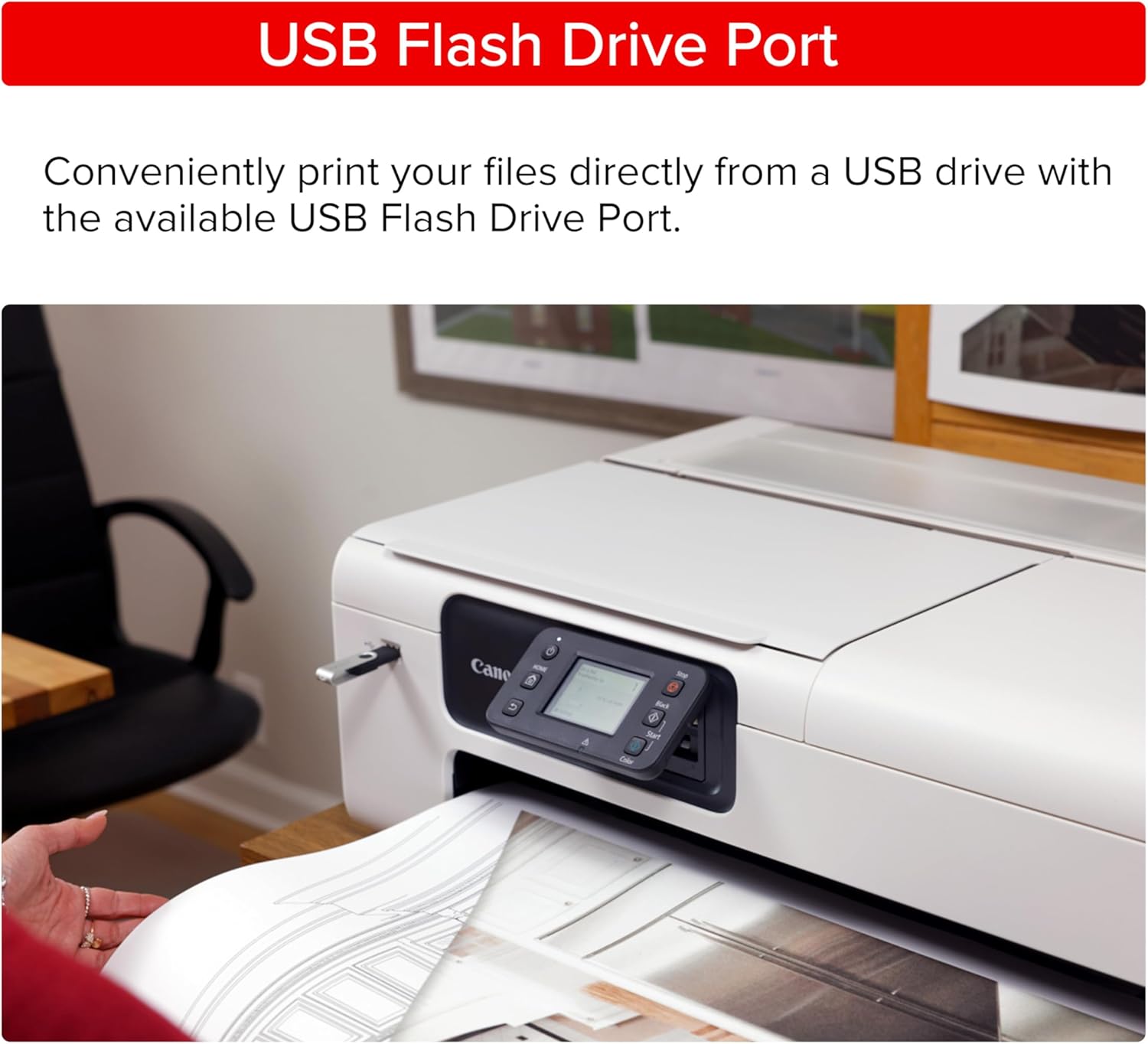 - USB FLASH DRIVE PORT - Easily print in large format by just inserting a USB Flash Drive.