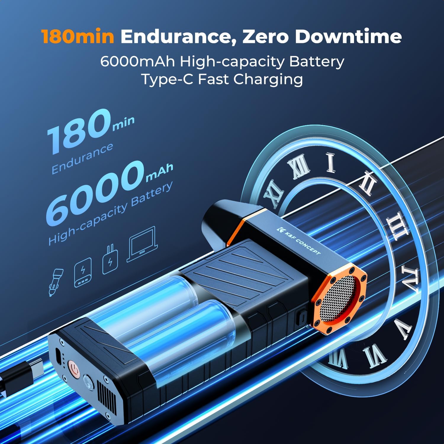 - 6000mAh POWERFUL & RECHARGEABLE - 3x Battery Capacity❗(vs. standard 2000mAh) delivers 180-minute runtime, with intelligent thermal protection: High-Speed Mode auto-shutoff activates after 10 minutes of continuous use to prevent motor overheating.