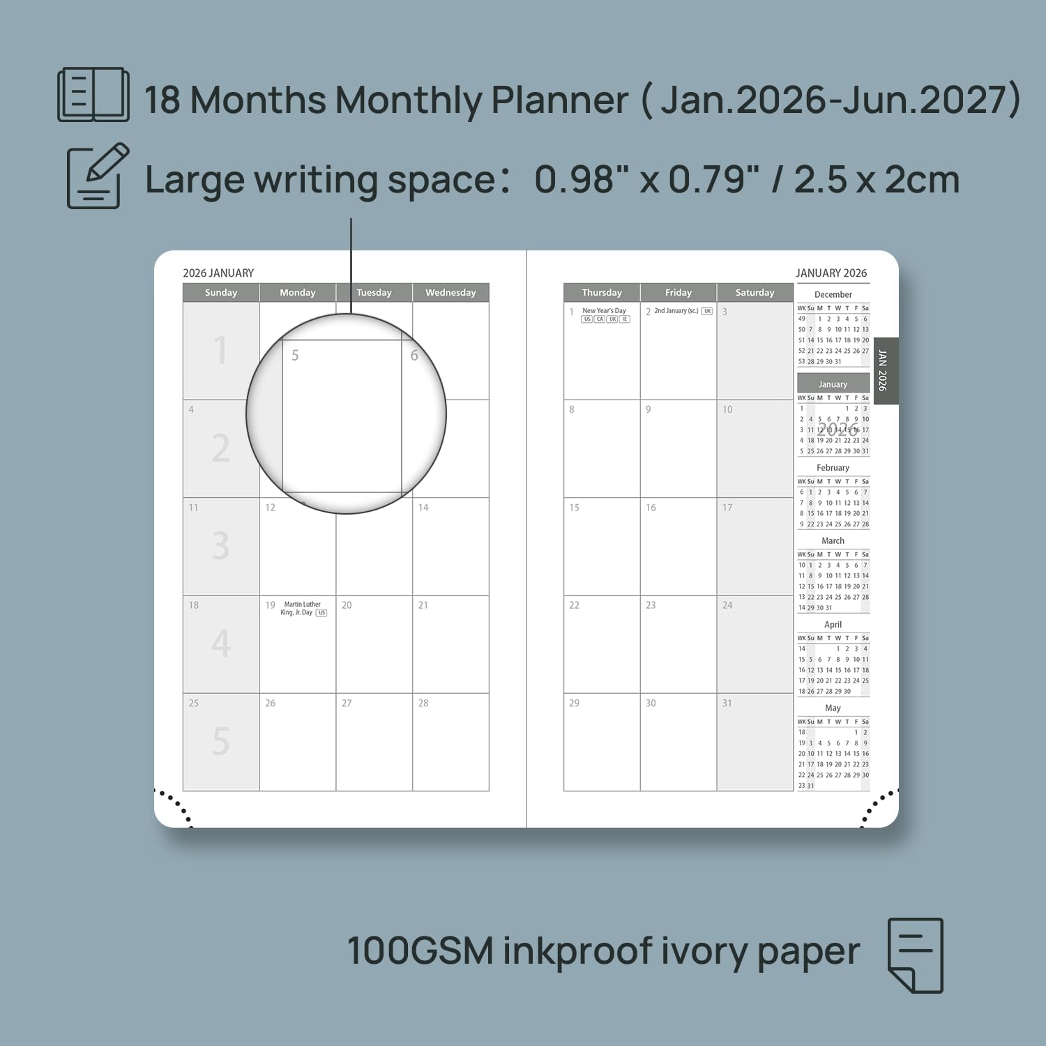 - 18-MONTH MONTHLY CALENDAR: Featuring pages from Jan.2026 - Jun. 2027 with week numbers and holidays marked, this planner is perfect for long-term planning. Each month covers a 2-page spread with dotted notes and an expense tracker to help you manage deadlines and goals efficiently.