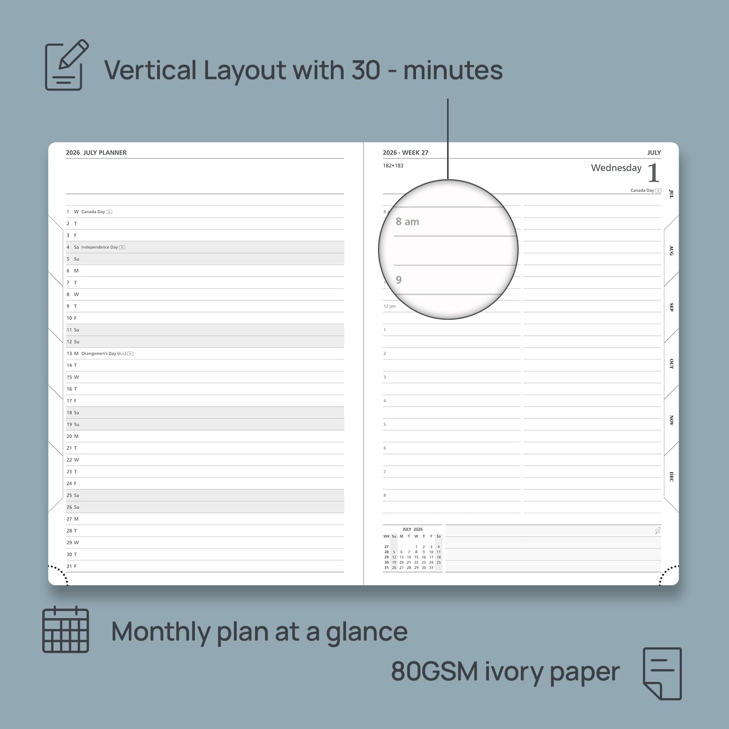 - ONE PAGE PER DAY EVEN WEEKENDS - This 2026 daily planner features 365 daily pages,which presents spacious everyday planning with hourly schedules for your appointments, which makes your busy daily routines organized.