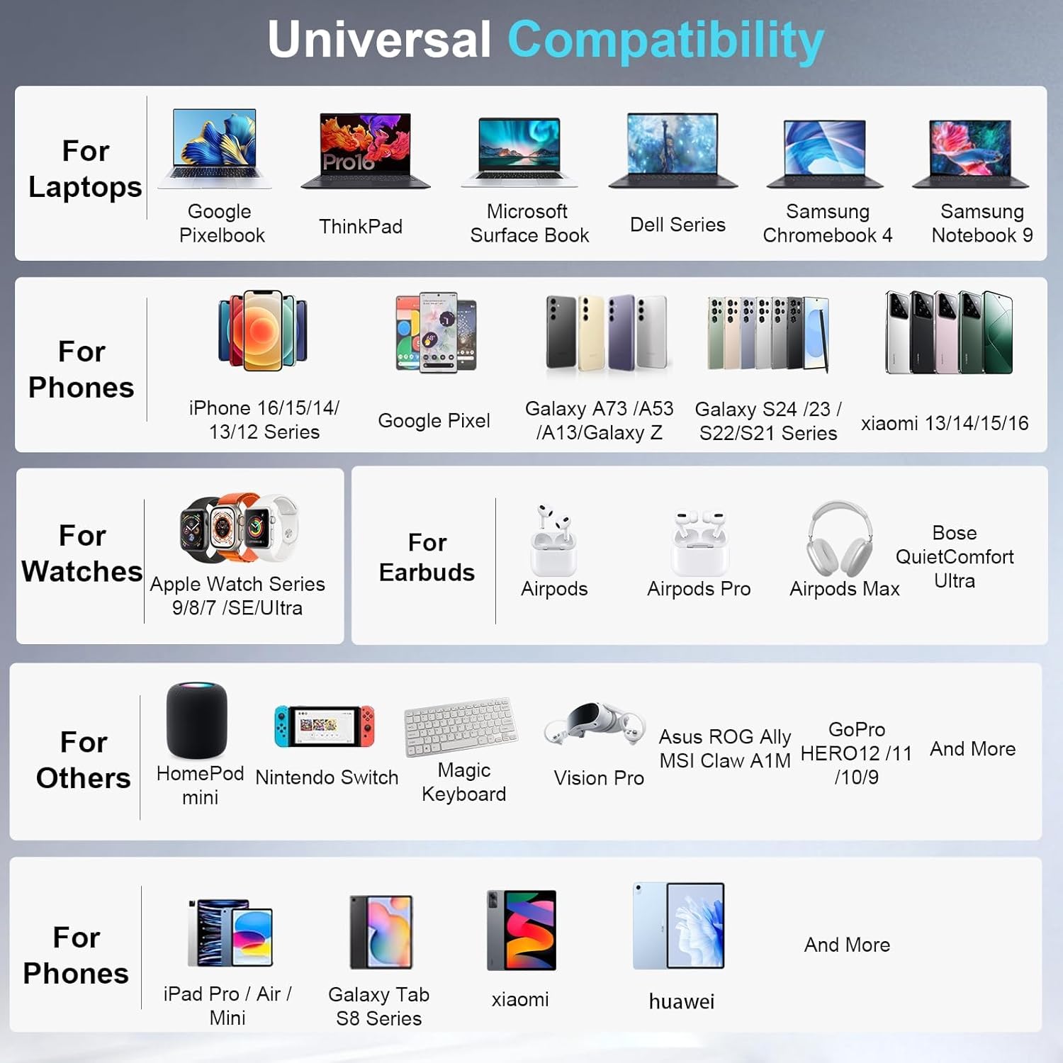 - Compatible Devices : Compatible with Android devices, Smartphone, Tablet, Smartwatches, Speakers, Laptops,Headphones, such as MacBook Pro 13''/ MacBook Pro 15''/ MacBook Pro 16"/ MacBook Air 13''/ MacBook 12''; iPhone 17/16/15/14 14plus 14 pro max 13/ 13 Mini/ 13 Pro/ 13 Pro Max, iPhone 12/ 12 Mini/ 12 Pro/ 12 Pro Max/ XS/ XS Max/ XR/ X/ 11/ 11 Pro/ 11 Pro Max/ iPhone SE 2020/ 8 Plus/ 8; Samsung Galaxy S21+/ S21/ S21 Ultra/ S21 FE/ S20+/ S20/ S10/ S10e/ S10+/ S9/ S9+/ S8/ S8+/ Note 20/ Note 9/ Note 8/ Z Flip/ Z Fold; Dell XPS 15/ 13; Google Pixel 5/ Pixel 4a/ 4 XL/ 4/ Pixel 3a/ 3a XL/ 3 XL/ 2 XL /2; iPad Pro 12.9''/ iPad Pro 10.5''/ iPad Pro 11''/ iPad Mini Series/ iPad Air Series; AirPods Pro, Nintendo Switch; LG G7/ V30+; Nexus 5X/ 6P, Sony XZ2 Premium, Sony XZ3, and more. Compatible with Android devices, Smartphone, Tablet, Smartwatches, Speakers, Laptops,Headphones, such as MacBook Pro 13''/ MacBook Pro 15''/ MacBook Pro 16"/ MacBook Air 13''/ MacBook 12''; iPhone 17/16/15/14 14p… See more