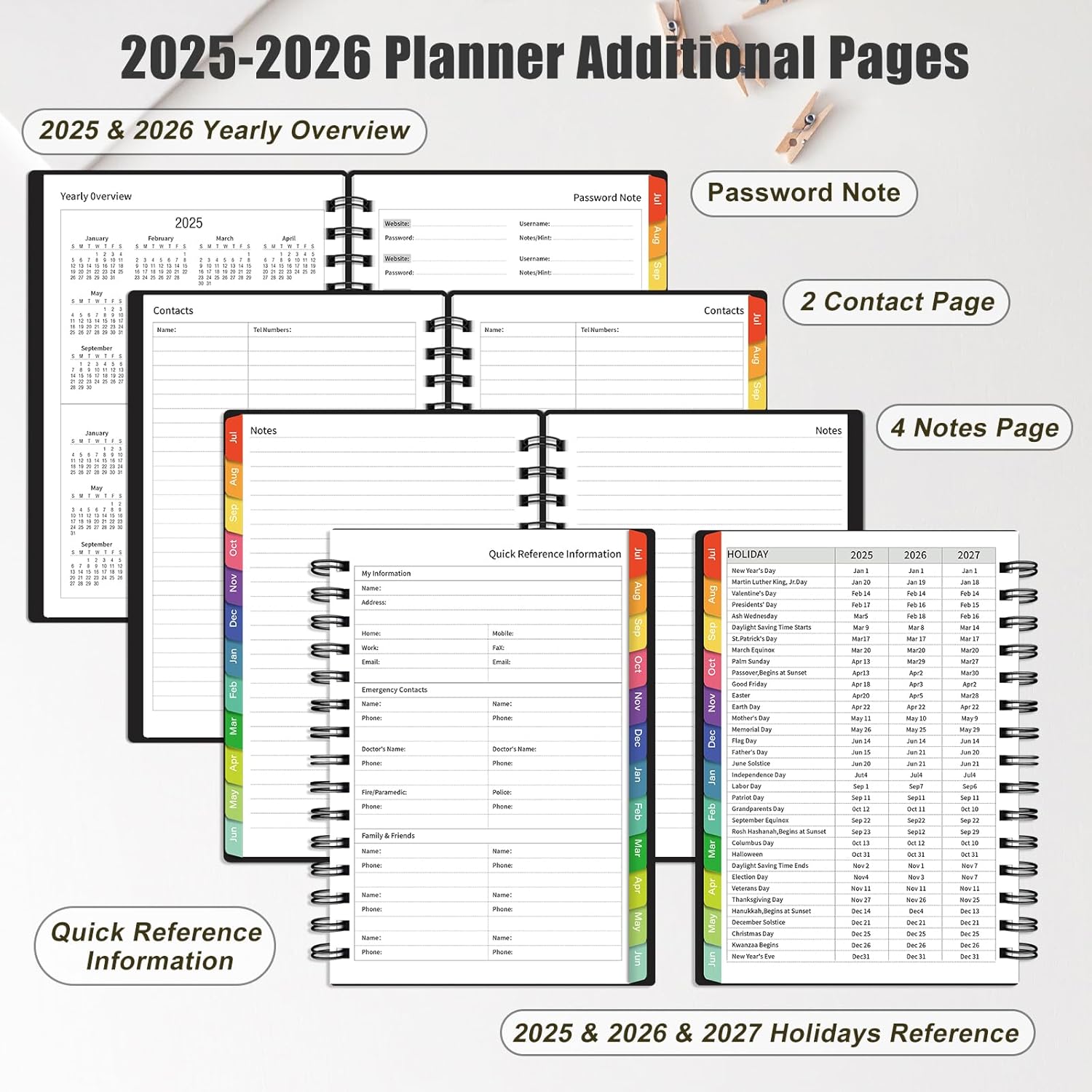 Daily Planner 2025-2026, 18 Month Planner with Tabs, July 2025 - December 2026 Weekly and Monthly Academic Year Calendar Spiral Time Management, 100GSM Thick Paper, Twin-Wire Binding, A5 Size, Black