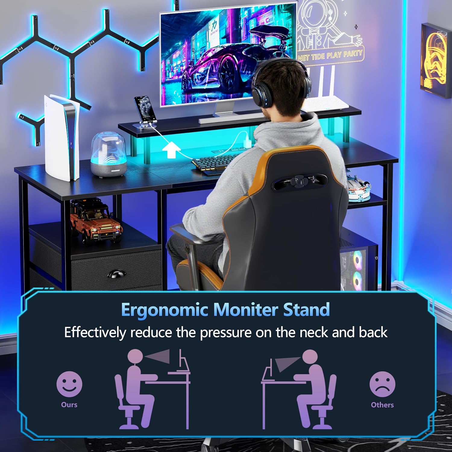 Furologee 51" Gaming Desk with Power Outlets & LED Lights, Reversible Computer Desk with File Cabinet & Monitor Stand for Home Office, Large Work Table with Storage Shelves & Drawer, Black