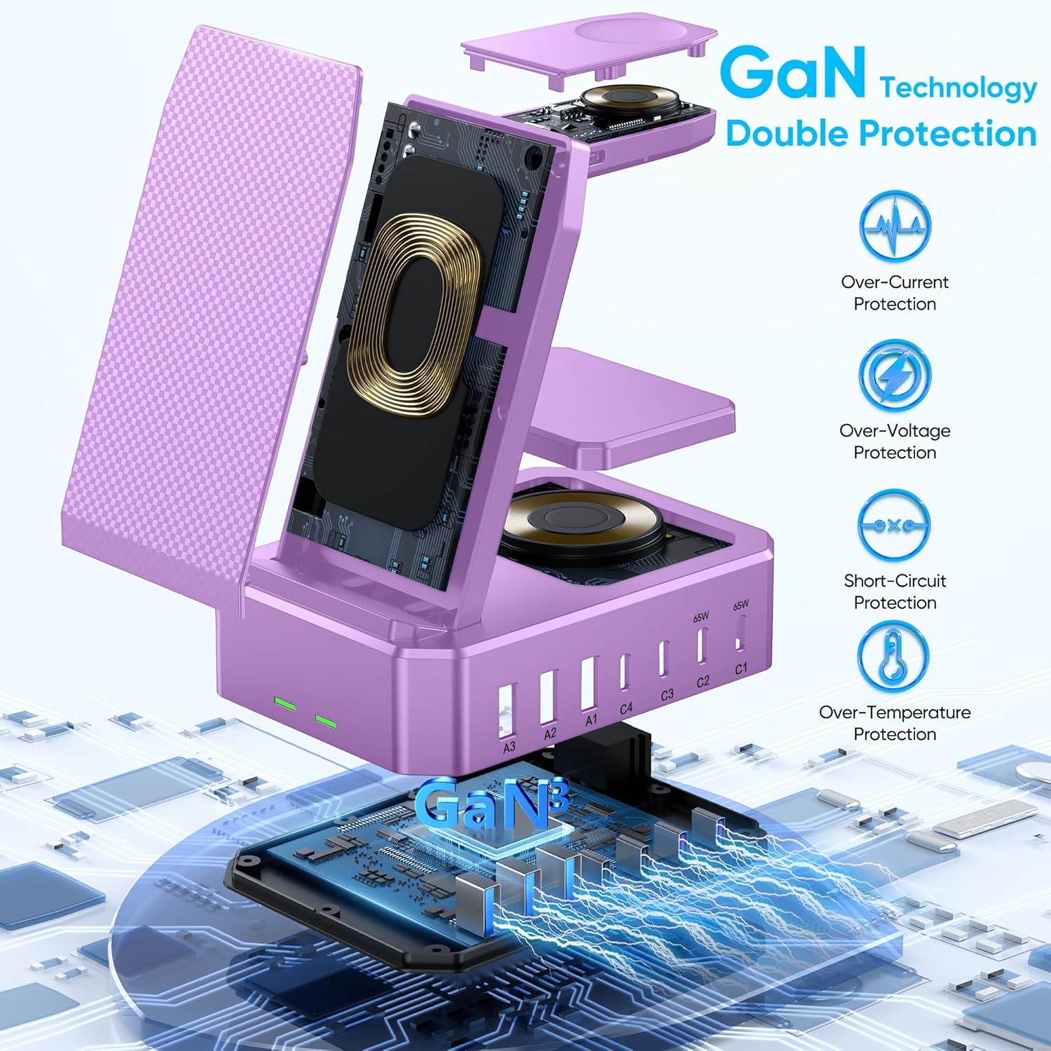 - 【300W USB C Charging Station for Multiple Devices】: This desktop multi-port charging station is the perfect solution for charging multiple devices! Our usb c charging station features 2 powerful 65W USB-C ports designed specifically for charging laptops, 2 efficient 30W USB-C ports and 3 versatile 20W USB-A ports . Together with wireless charging station total output can be up to 300W. You can conveniently fast charge your Apple devices and Android devices at the same time.