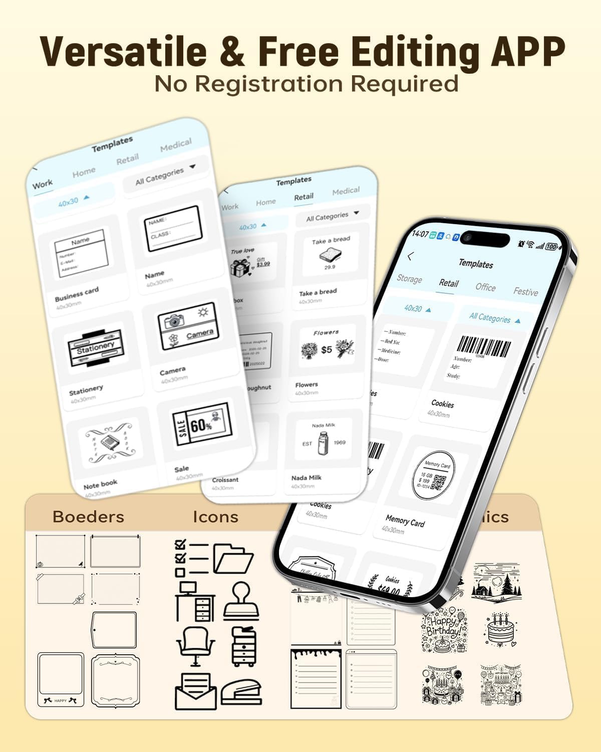 - 【Versatile APP & Easy to use】Large label maker no sign-up needed and free of all fonts, icons, sybomls, templates in there. Easily customize text size, style, and formatting for the perfect look. Save templates for one-tap reprinting. DIY labels style to build up your small business!