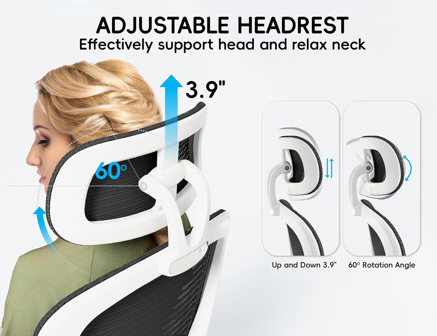 - Adjustable 3D Headrest for Neck & Shoulder Relief:Customize your comfort with our 3D adjustable headrest, designed to cradle your neck and shoulders in the ideal position. Tilt, height, and angle adjustments ensure proper alignment, reducing strain from hours at your desk. Finally, a chair that cares for your posture as much as you do