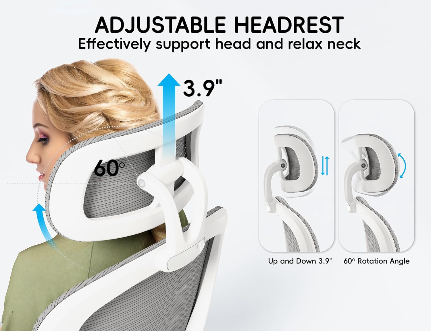 - Adjustable 3D Headrest for Neck & Shoulder Relief:Customize your comfort with our 3D adjustable headrest, designed to cradle your neck and shoulders in the ideal position. Tilt, height, and angle adjustments ensure proper alignment, reducing strain from hours at your desk. Finally, a chair that cares for your posture as much as you do