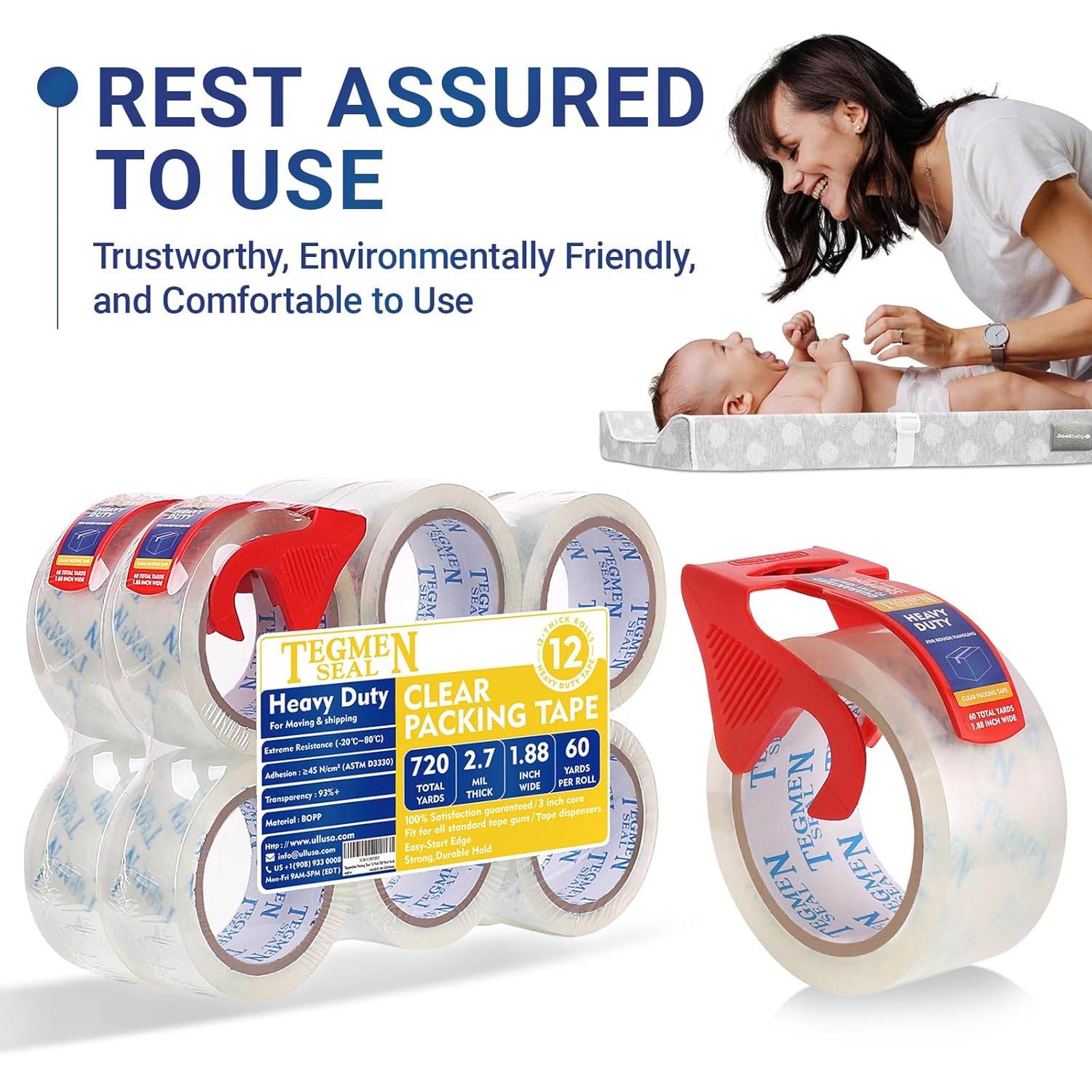 Heavy Duty Clear Packing Tape with Dispenser Combo for Shipping, Moving & Storage,Thicker Clear Packing Tape, 1.88 inches Wide, 60 Yards Per Roll, 12 Pack 720 Total Yards