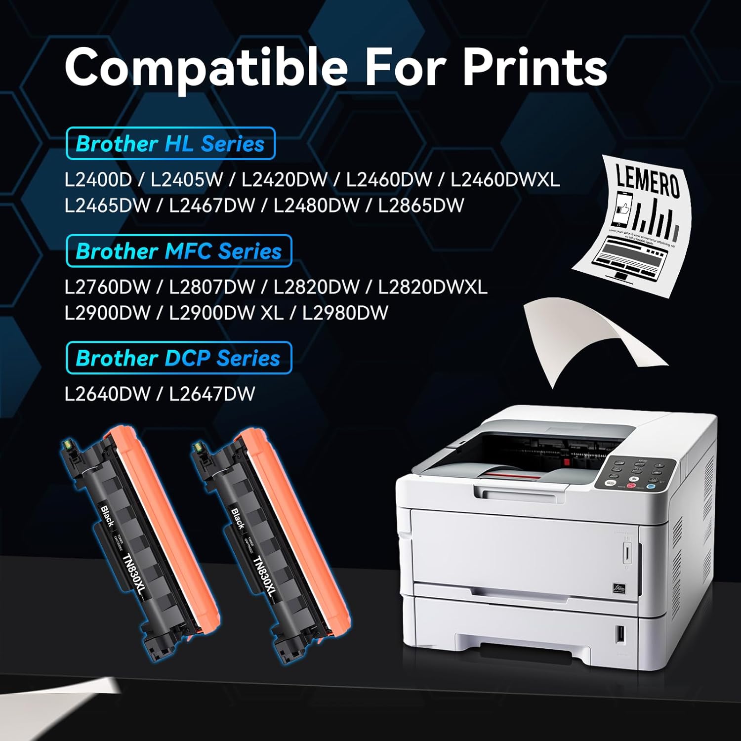 - TN830XL Toner Cartridge Compatible for Printers: LEMERO compatible toner cartridges replacement for Brother TN830XL work with brother DCP-L2640DW HL-L2460DW HL-L2405W HL-L2400D MFC-L2820DW HL-L2420DW HL-L2460DWXL HL-L2465DW HL-L2467DW HL-L2865DW HL-L2480DW DCP-L2647DW MFC-L2760DW MFC-L2807DW MFC-L2820DWXL MFC-L2900DW MFC-L2900DWXL MFC-L2980DW printer