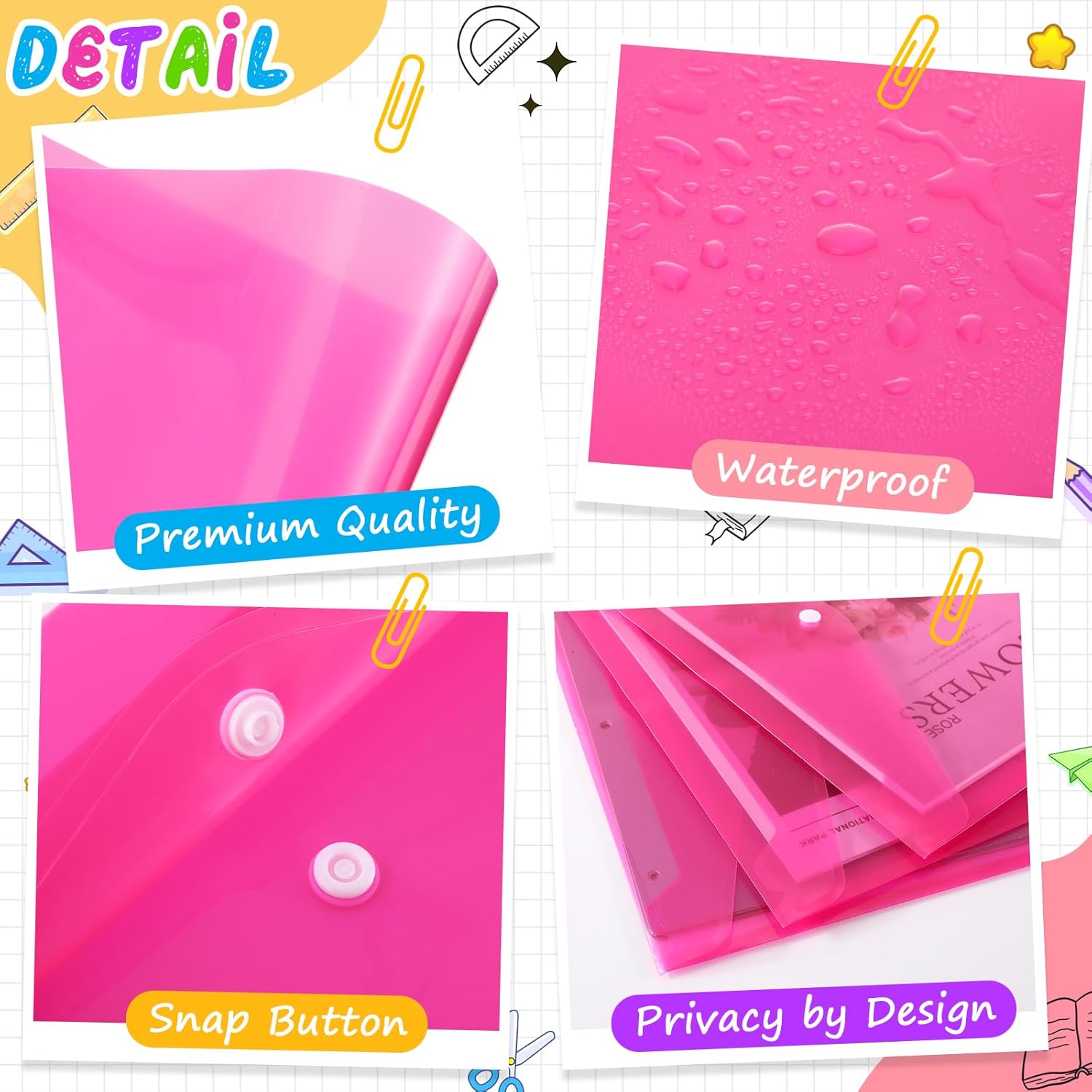 - Snap and Transparent Design: our plastic file folders are designed with snaps, which can be easily opened and closed, easy to store documents and not easy to slide out and lose; Transparent design to keep the contents visible, convenient to find documents