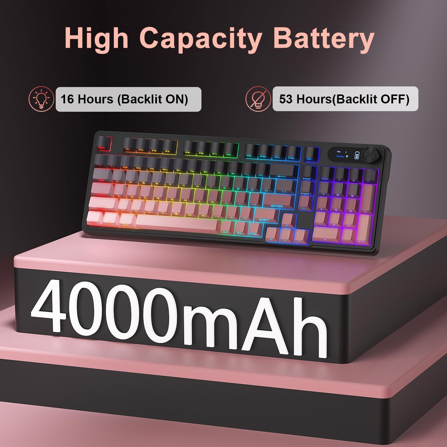 - 【Smart Screen & Control Knob】: The keyboard built-in digital display shows connection mode, battery level, and system status (WIN/MAC) at a glance—no more guessing. Use the intuitive knob to easily adjust volume or backlight effects without breaking your focus, whether you're working, studying, or gaming.