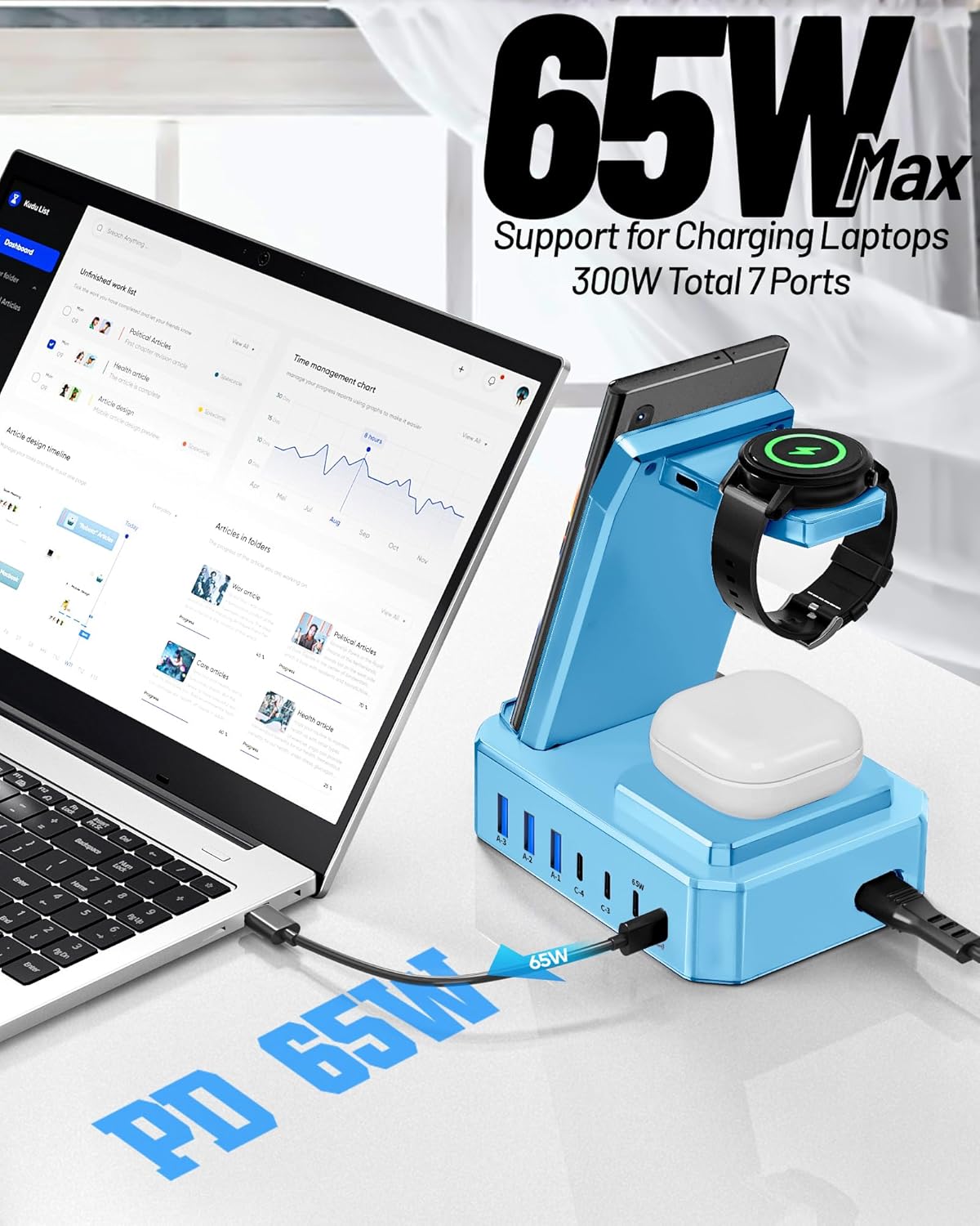 - 【300W Charging Station for Multiple Devices】: Charges up to 10 devices simultaneously.This desktop phone charging station is the perfect solution for charging multiple devices! Our charger station features 2 powerful 65W USB-C ports designed specifically for charging laptops, 2 efficient 30W USB-C ports and 3 versatile 30W USB-A ports . Samsung wireless charging station total output can be up to 300W. You can conveniently fast charge your samsung devices and other devices at the same time.