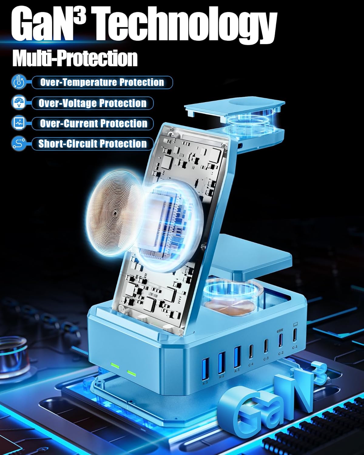 - 【Safe Charging&Multiple Protection】: Our Dual 65W PD usb c fast charger dock is equipped with the latest intelligent and efficient chipset with GaN III technology to ensure fast and safe powering of your devices. Ready to charge your Macbook series and other laptops. Our phone and watch charging station features over-current, over-voltage, over-temperature and over-charging protection. The internal circuitry is designed to prevent overcharging from damaging your device, ensuring safe charging.