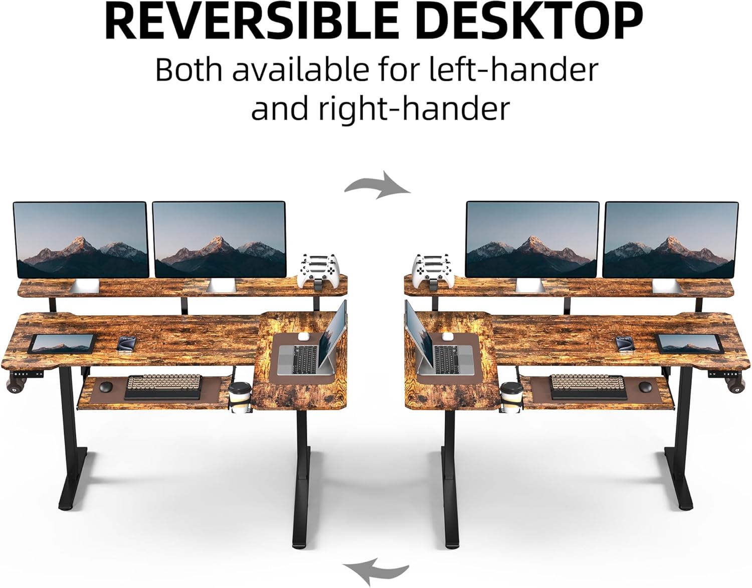 - 【Reversible L-Shaped Corner Design】Our sit stand desk offer reversiable 59" x 48" adjustable desktop with shelves that can be used both left-handed and right-handed and eassly support more than 2 monitors for daily use