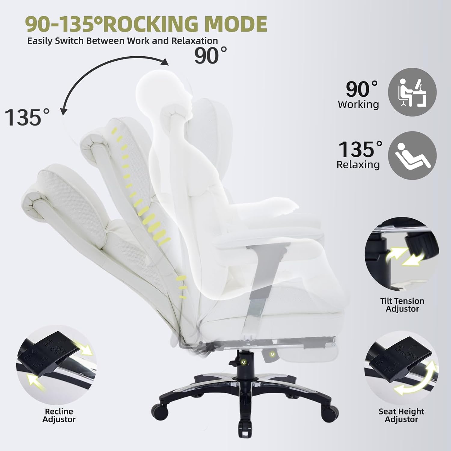 Efomao White Big and Tall Office Chair with Footrest – Ergonomic High-Back Computer Chair with Adjustable Armrests, Wide Seat – Modern Home Office, Gaming & Study Chair for Young Professionals