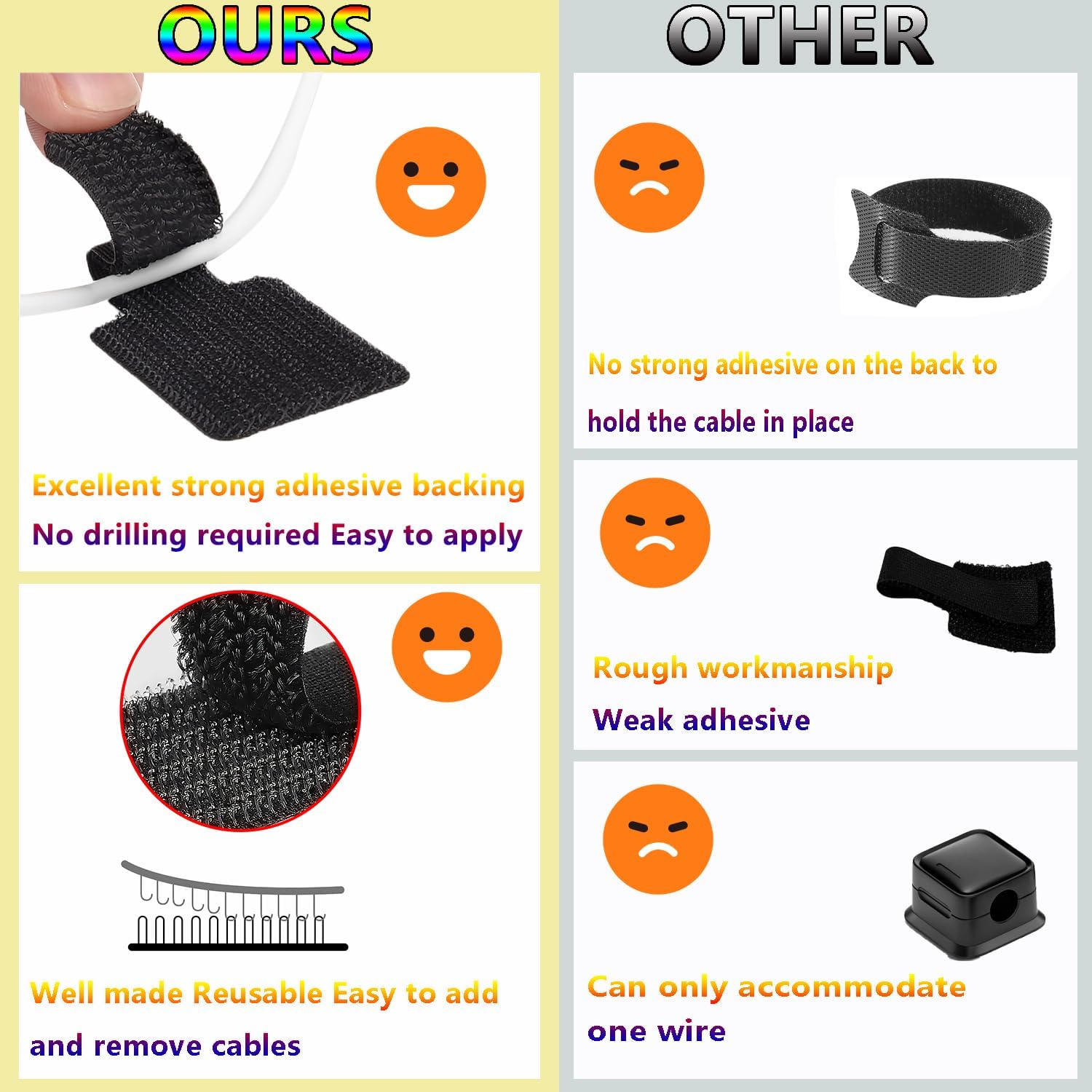 - RUGGEDIZED CABLE MANAGEMENT:Cable ties are made of high quality nylon bonding material and strong adhesive backing, the special backing allows the cable ties to adhere firmly to the surface, thus safely bundling the cables to keep them neatly organized.