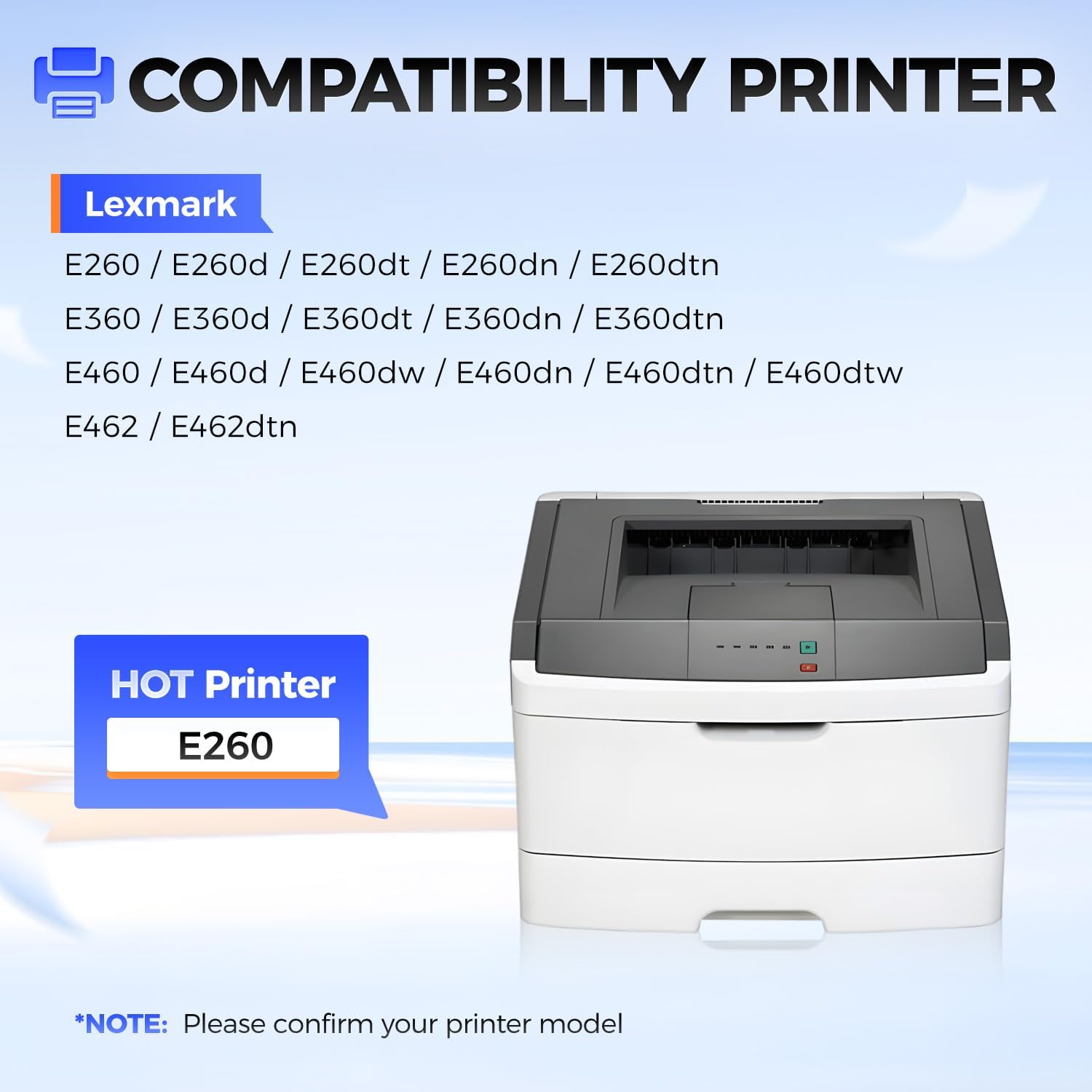 - Compatible Printer: Compatible with Lexmark E260 E260d E260dt E260dn E260dtn E360 E360d E360dt E360dn E360dtn E460 E460d E460dw E460dn E460dtn E460dtw E462 E462dtn Printer.