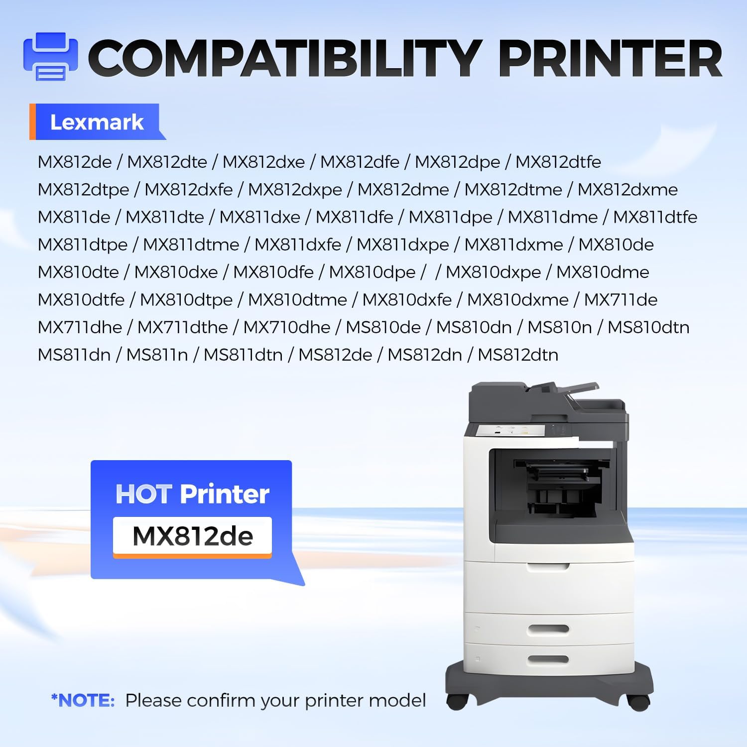 - Compatible Printer: Compatible with Lexmark MX812 MX811 MX810 MX710 MS810 MS811 MS812 MX812de MX812dte MX812dxe MX812dfe MX812dpe MX812dtfe MX812dtpe MX812dxfe MX812dxpe MX812dme MX812dtme MX812dxme MX811de MX811dte MX811dxe MX811dfe MX811dpe MX811dme MX811dtfe MX811dtpe MX811dtme MX811dxfe MX811dxpe MX811dxme MX810de MX810dte MX810dxe MX810dfe MX810dpe MX810dxpe MX810dme MX810dtfe MX810dtpe MX810dtme MX810dxfe MX810dxme MX711de MX711dhe MX711dthe MX710dhe MS810de MS810dn MS810n MS810dtn MS811dn MS811n MS811dtn MS812de MS812dn MS812dtn Series Printer.