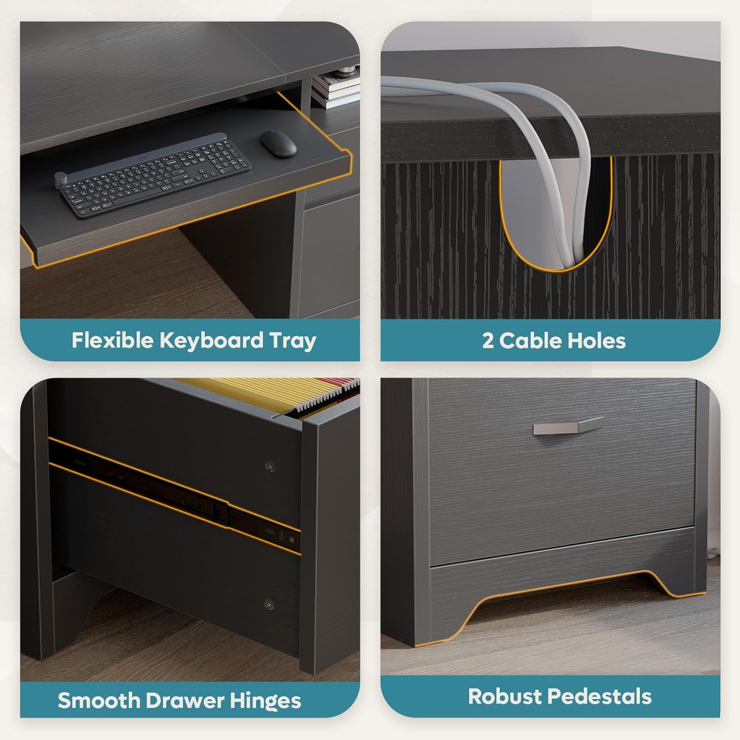 - Ample Storage & Organization: With two open storage compartments for frequently used items and four smooth-glide drawers—two for office supplies and two for letter/A4/legal-size hanging files—this pc desk keeps everything within arm’s reach. Premium drawer slides ensure smooth operation, so you can retrieve your essentials quickly