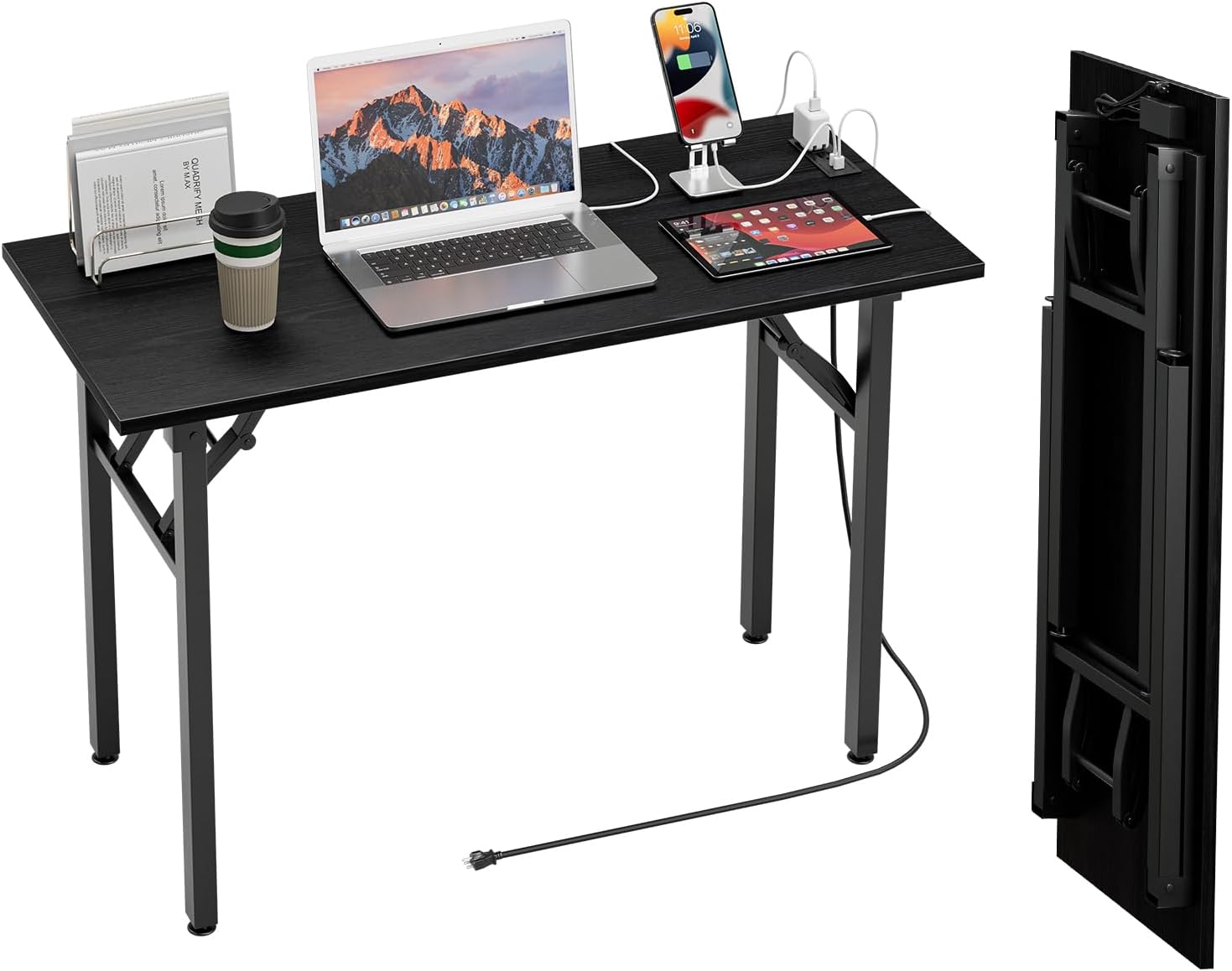 TEMI Small Computer Desk Folding Table - No Assembly, Compact 44.3" Foldable Desk with Power Outlets & USB Charging Port, Portable Small Office Desk, Ideal Mini Study Table, Dark Oak