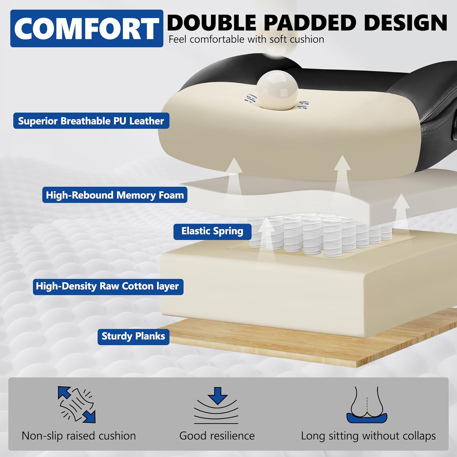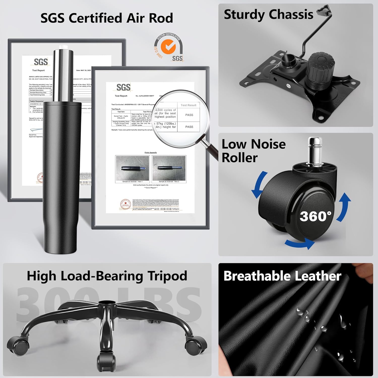 - Sturdy & Durable:Heavy-duty metal base supports up to 300 lbs. Reinforced with SGS-certified Grade 3 gas lift and 360° silent swivel casters for stability and smooth mobility. Explosion-proof base ensures long-lasting reliability.
