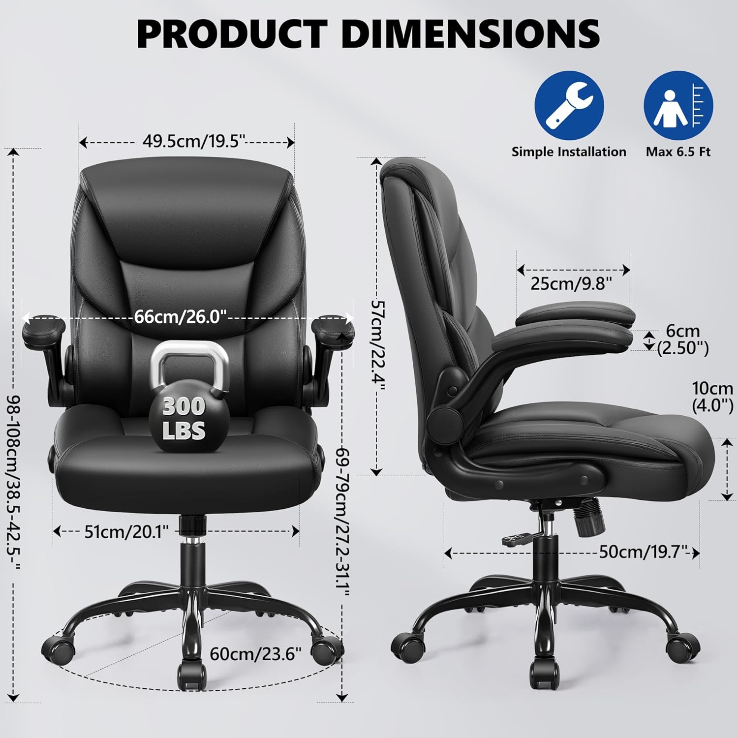 PU Leather Executive Office Chair, Ergonomic High-Back Computer & Gaming Chair with Adjustable Height, Rolling Swivel & Flip-Up Armrests, Comfy Padded Seat for Home Office-Black