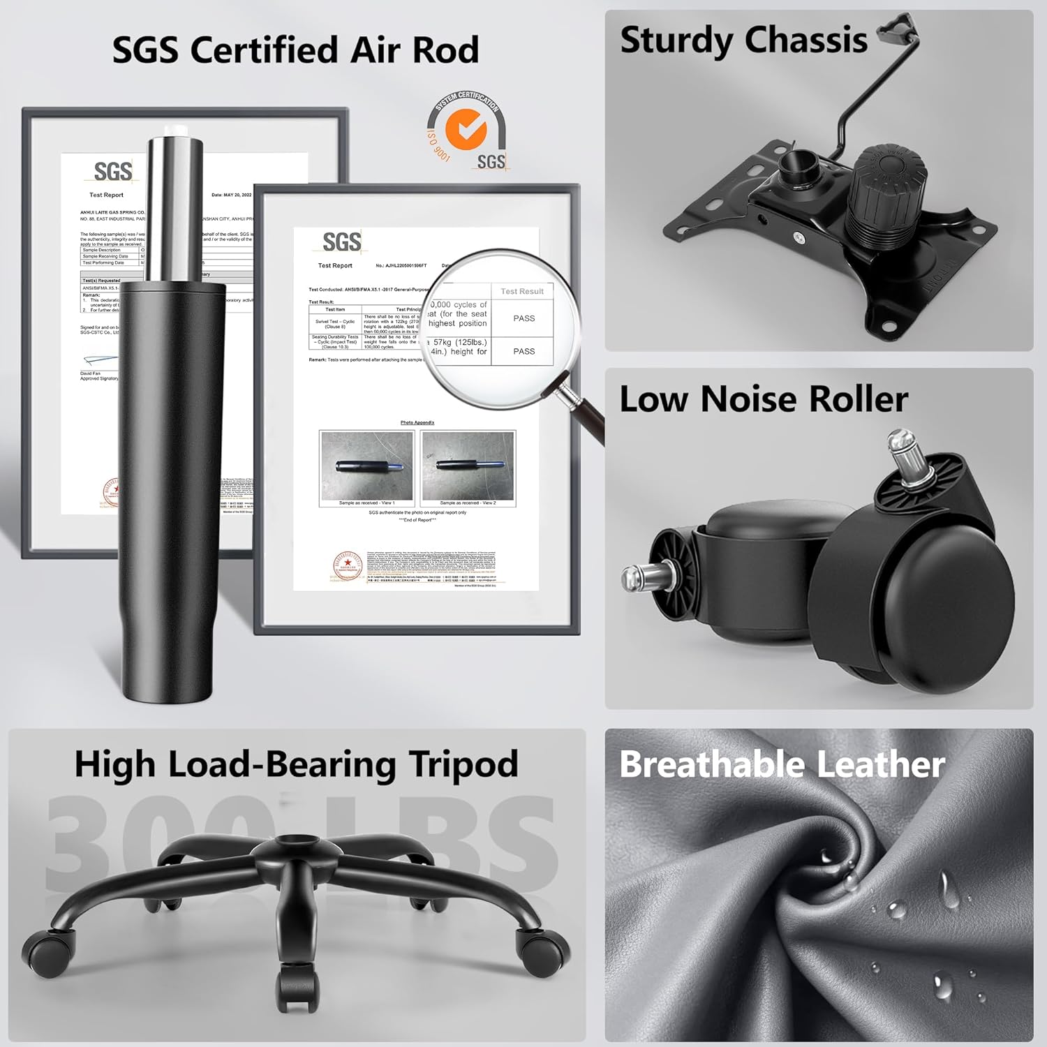 - Sturdy & Durable:Heavy-duty metal base supports up to 300 lbs. Reinforced with SGS-certified Grade 3 gas lift and 360° silent swivel casters for stability and smooth mobility. Explosion-proof base ensures long-lasting reliability.