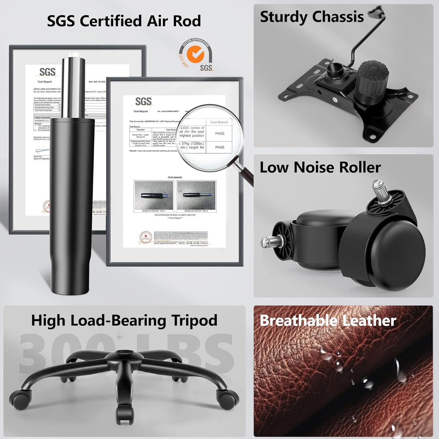 - Sturdy & Durable:Heavy-duty metal base supports up to 300 lbs. Reinforced with SGS-certified Grade 3 gas lift and 360° silent swivel casters for stability and smooth mobility. Explosion-proof base ensures long-lasting reliability.