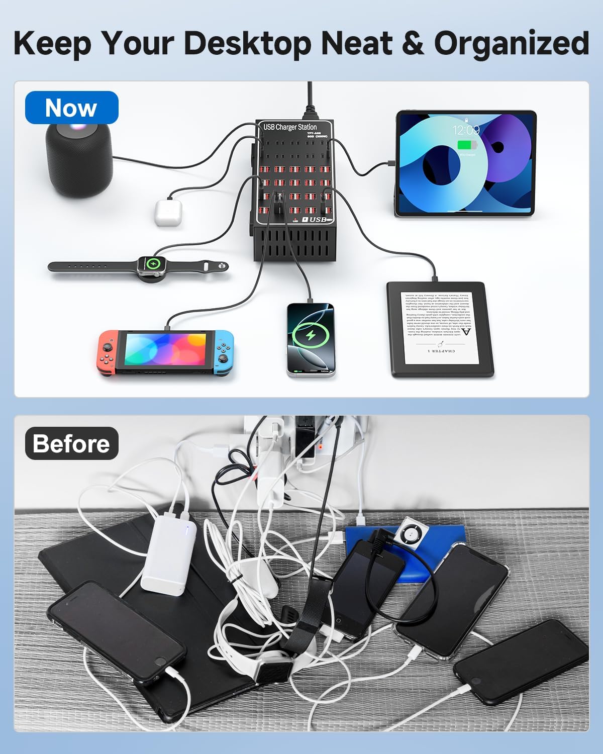 - Fast Charging & Wide Compatibility: Each of the 60 ports has an independent smart chip to automatically deliver the safest and fastest charge. Compared to other low-power USB charging stations, this multi usb charging hub offers up to 3x faster charging speeds.Compatible with iPhone, iPad, Samsung Galaxy, Kindle, AirPods, smartwatches, USB~C devices, and more.