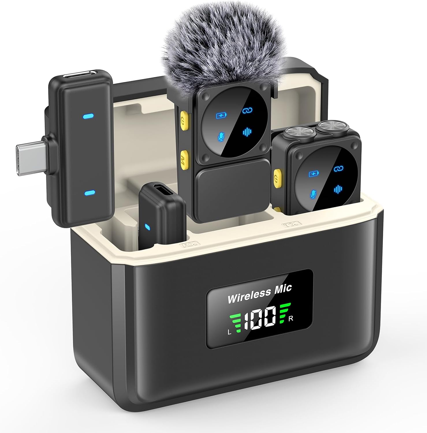 - Included Components : 1 x 80H Charging Case, 1 x Charging cable, 1 × USB C Receiver+ 1 x Lightning Receiver, 2 x Windscreen Cover, 2 × Multi-function Transmitters 1 x 80H Charging Case, 1 x Charging cable, 1 × USB C Receiver+ 1 x Lightning Receiver, 2 x Windscreen Cover, 2 × Multi-function Transmitters
