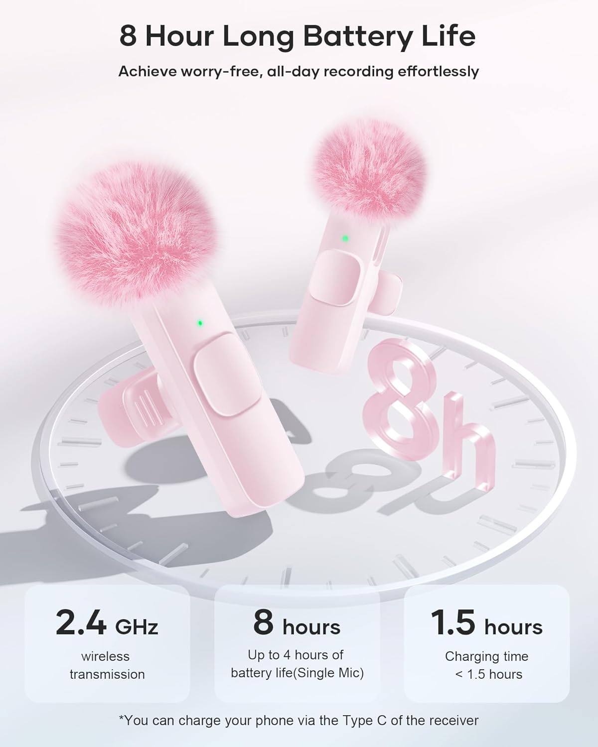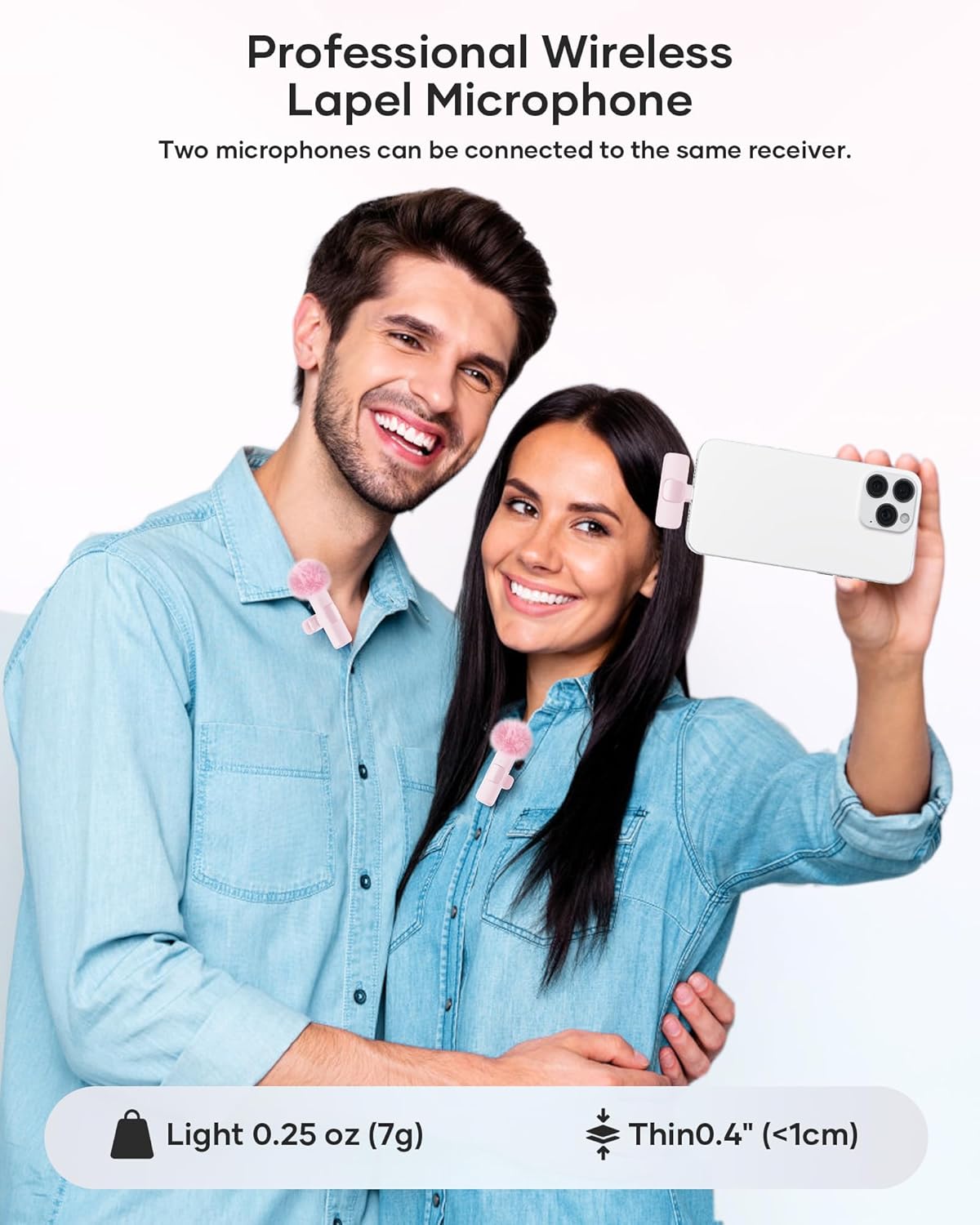 Wireless Lavalier Microphone for iPhone iPad and Android Phone, 2 Pack Lapel Mic Plug and Play Wireless Mic Noise Reduction Microphone for Video Recording Interview Podcast Vlog YouTube Tiktok (Pink)