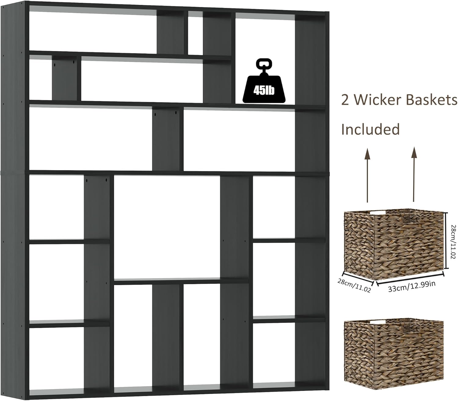 - 【Spacious Organization】71"H x 55"W x 11.8'' D dimensions for this large storage bookshelf. Maximizes vertical space with 16 versatile open compartments in graduated sizes. Effortlessly accommodates books, decorative objects, storage bins, and awkwardly shaped items for whole-home storage solutions.